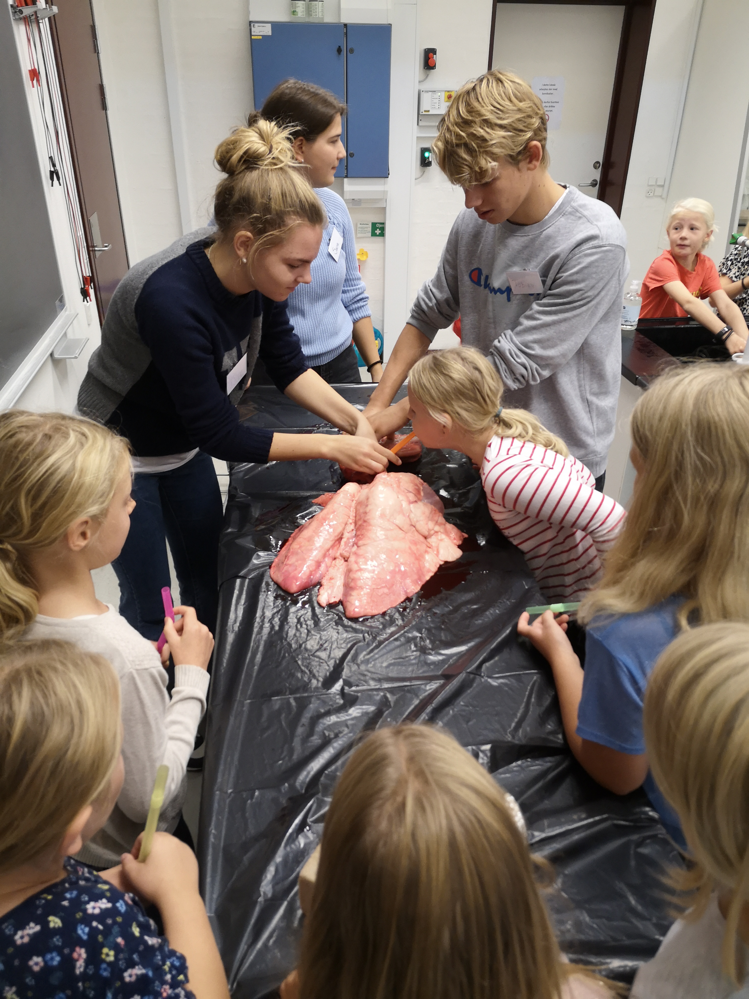 Et par af eleverne fra folkeskolen rynkede lidt på næsen, da de blev præsenteret for en rigtig svinelunge, der ligner den menneskelige lunge, blot er den lidt større. Og der blev lagt kræfter i, da eleverne blev lovet et kilo chokolade, hvis de via et rør kunne puste lungen så meget op, at den gik i stykker. Skolen beholdt chokoladen.