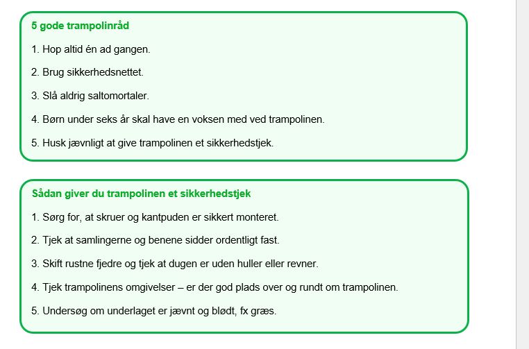 ”Et sikkerhedstjek af havetrampolinen kan være afgørende for, at legen ikke ender med en ulykke. Det er derfor vigtigt, at forældre tager sig tid til at tjekke trampolinen, inden børnene bruger den. Der er flere vigtige områder, hvor trampolinen bør tjekkes. Start med at sikre, at skruer og kantpuder er sikkert monteret, og at samlinger og ben sidder ordentligt fast. Udskift rustne fjedre og tjek, at der ikke er huller i dugen. Der skal også være god plads over og rundt om trampolinen, og underlaget skal være jævnt og blødt”, siger Henriette Madsen.