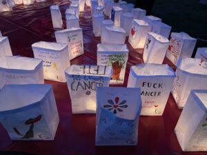 Allerførst ligger teltet, hvor forberedelserne til aftenens store lysfest foregår. Her kan man købe de hvide papirsposer/lygter, som senere, når mørket faldet på, skal lyse op i natten som symbol på tro håb og kærlighed. Tro på at det nytter at kæmpe imod kræften, håb for alle, der bliver ramt og kærlighed, der sikrer at de familier, der rammes af sygdommen, ikke skal føle sig alene.