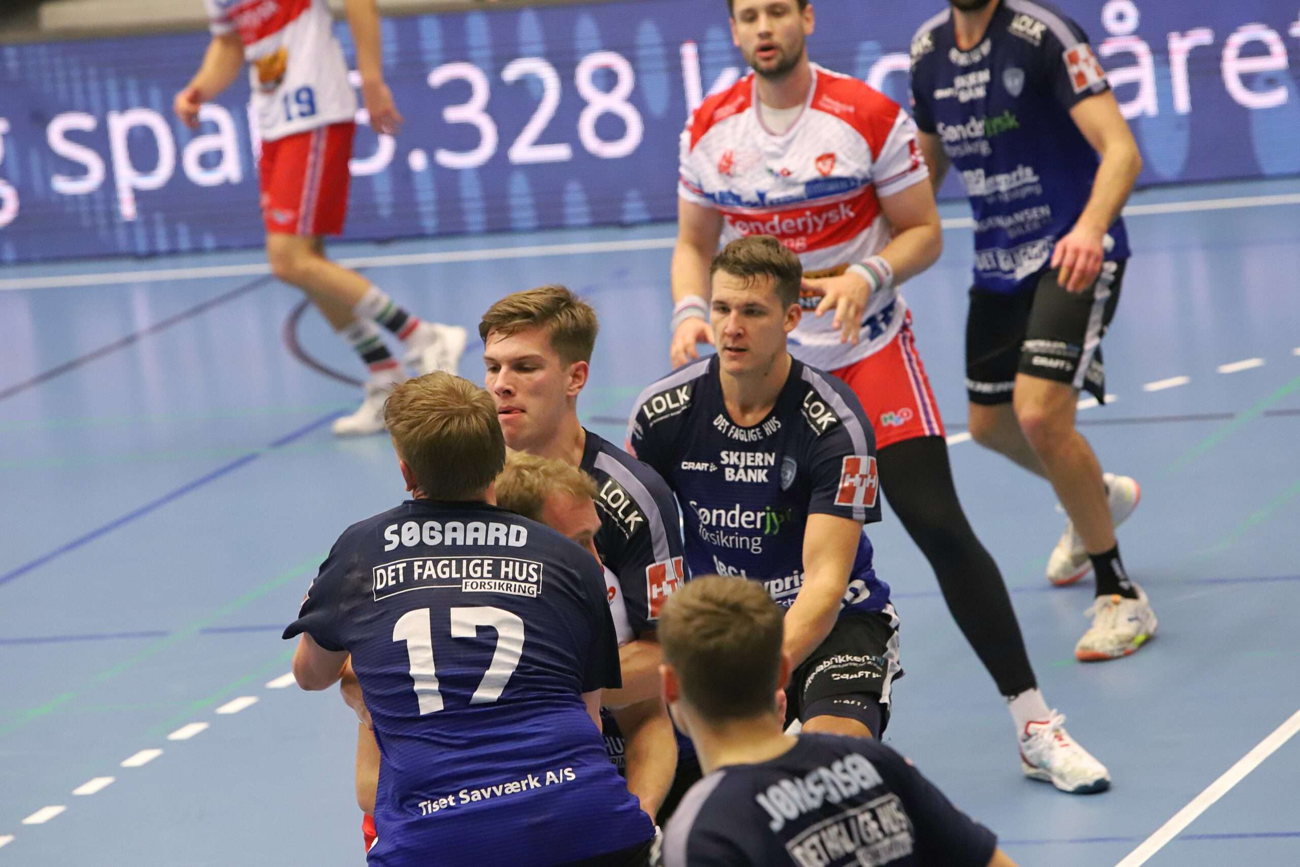 Når KIF-spillere kom tæt på forsvaret, var der lukket af i en sandwich – her med Andreas Søgaard og Magnus Haubro Jensen som kraftfulde brød. Spørgsmålet er så, hvorfor to andre forsvarspillere har fokus på samme forsøg på gennembrud – og dermed efterlader modstandere uden kontakt?