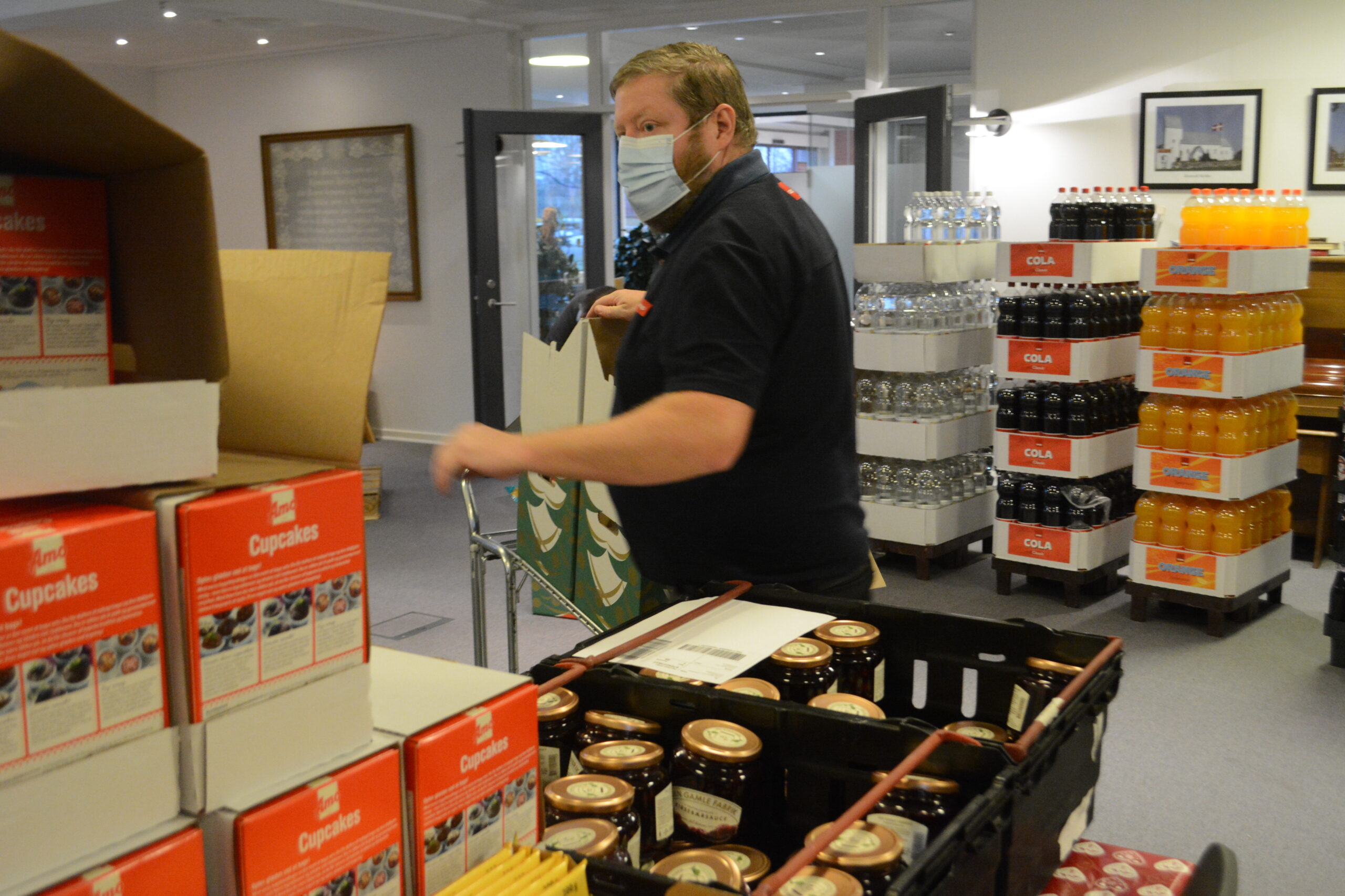 Det var Røde Kors, der havde bestilt pakkerne med alle mulige former for lækkerier og dagligvarer for at hjælpe nogle af de trængende mennesker, der har søgt om hjælp til at fejre julen.