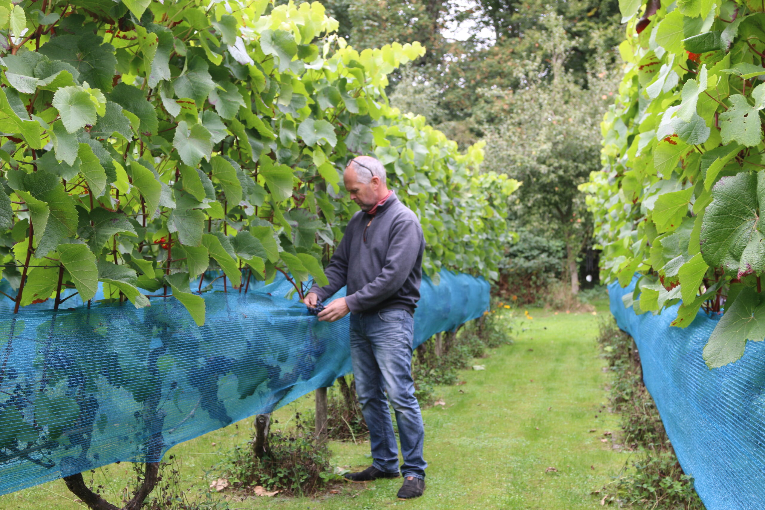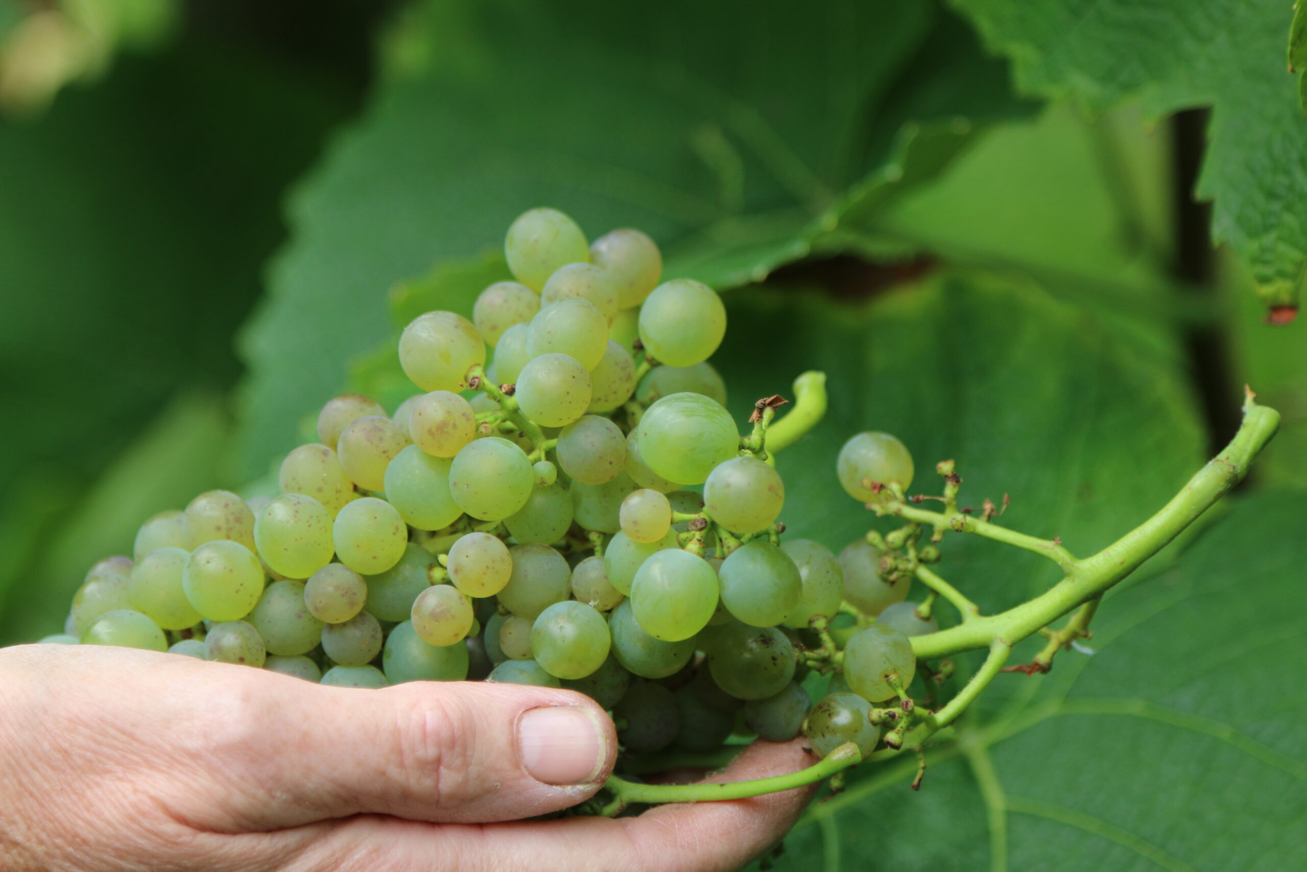 – Vi satte de første stokke tilbage i 2004, fortæller Karl Johan, da vi bevæger os ned mellem vinstokkene, som just ikke i form ligner, hvad man normalt ser vinstokke udformet i. – Jeg har valgt at lade mine vokse sig meget høje for dermed at sikre optimal udnyttelse af lyset og dermed sukker til druerne, fortæller vinbonden, som standser op og tjekker nogle af de grønne drueklaser.