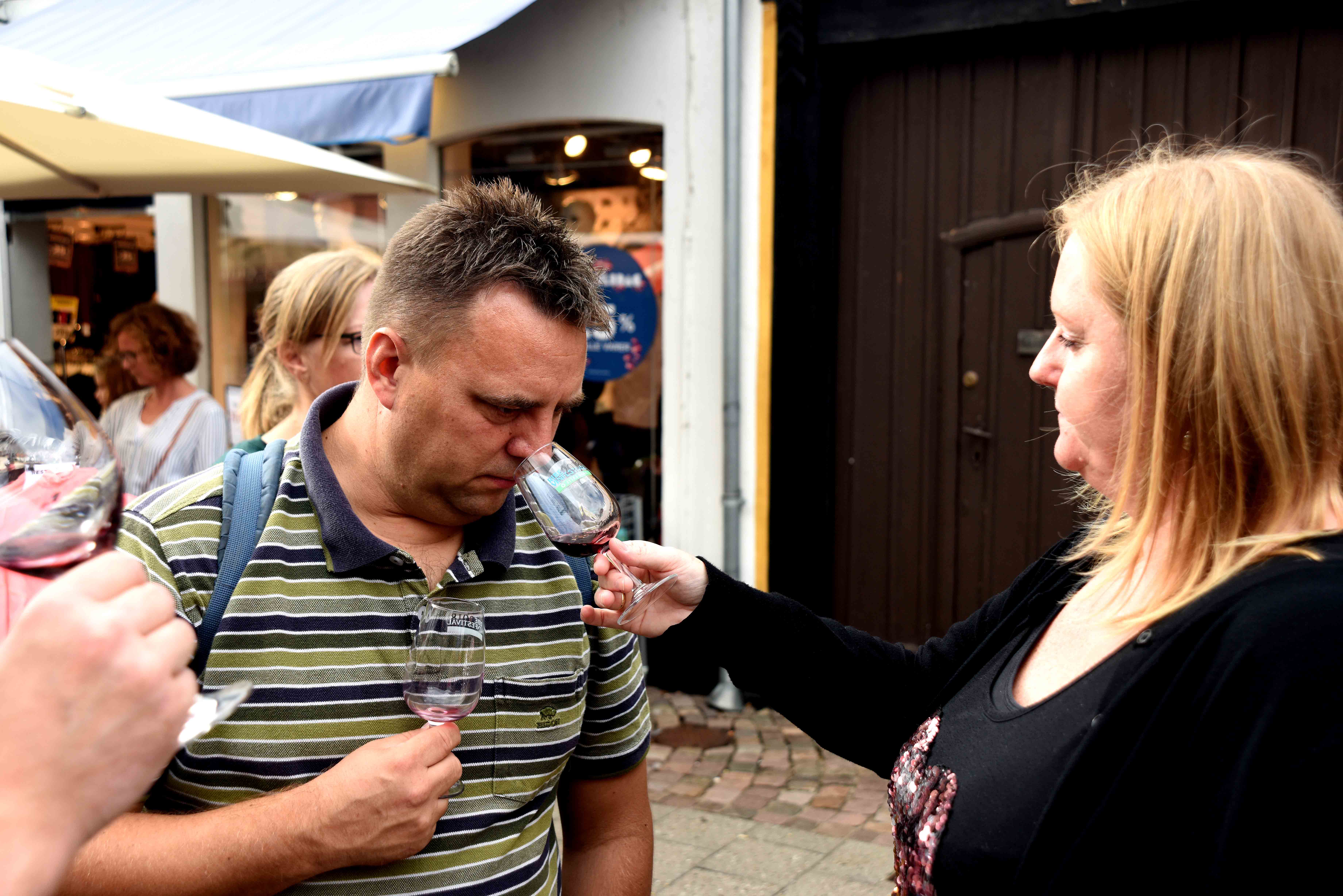 Længere oppe i gågaden gik snakken lystigt ved et af salgsstederne. Rosé skal være kold, var en af gæsterne ved at forklare en, der måske ikke var helt så kyndig ud i vinsmagningen, men så er det jo godt man kan få hjælp.