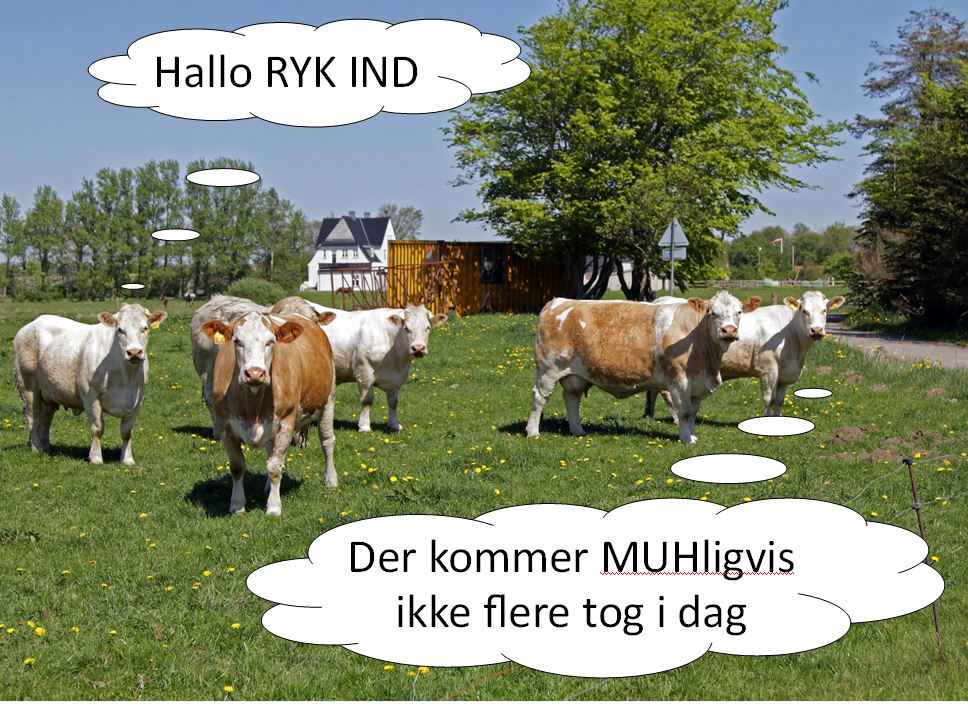 RYK IND havde åbnet en Cola Light og havde fundet en plads i skyggen – indstillet kameraet for et få et super skarpt billede i kassen, når Arrivatoget ville passere! Der gik nogen tid – intet tog. Der gik lang tid – intet tog og efterhånden var flasken tom! Men så kom en flok køer gående – over en lang strækning på en ”langhåret grøn græsmark” – standsede op og brølede ad RYK INDs medarbejder – som om de ville sige: ”Der kommer MUHligvis ikke tog i dag”.