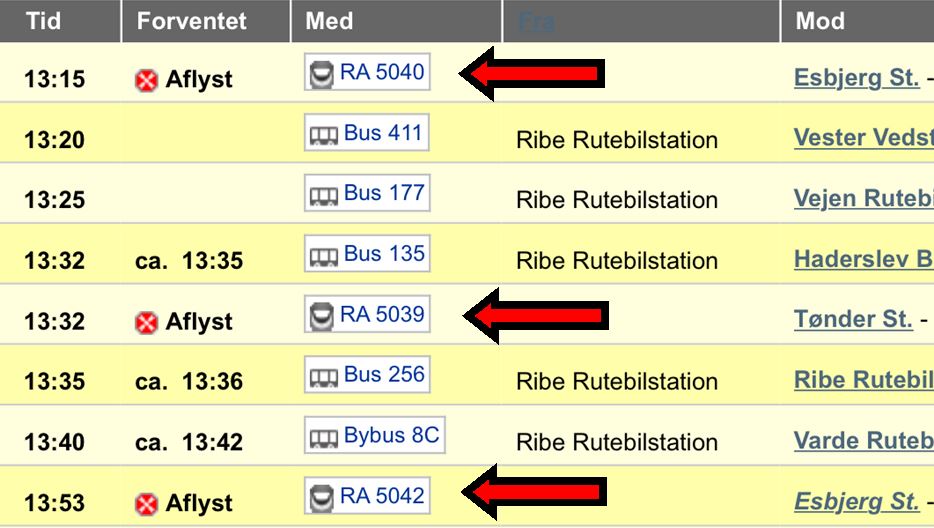 Og ganske rigtigt – et par klik på mobilen og Arrivas køreplan kunne vise, at alle tog var AFLYST!