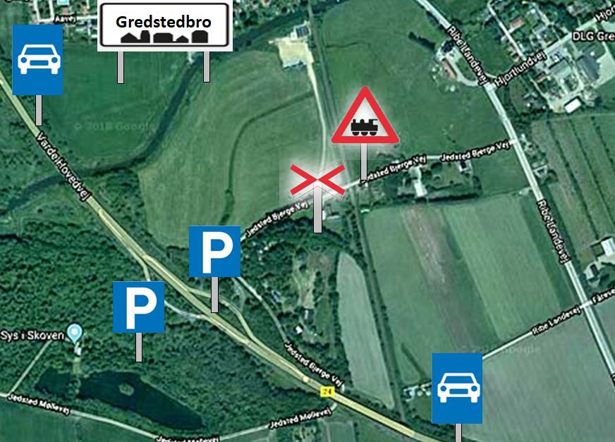 På Jedsted Bjerge Vej, som ligger på din venstre hånd efter afkørslen mod Gredstedbro (hvor motortrafikvejen starter) ligger vel nok Danmarks bedst sikrede ubevogtede jernbaneoverskæring. Der er på grusvejen 4 advarselstavler med blink og klokker – og dertil kommer skiltning mod ”ubevogtet jernbaneoverskæring” med undertavler: ”Se efter tog”!