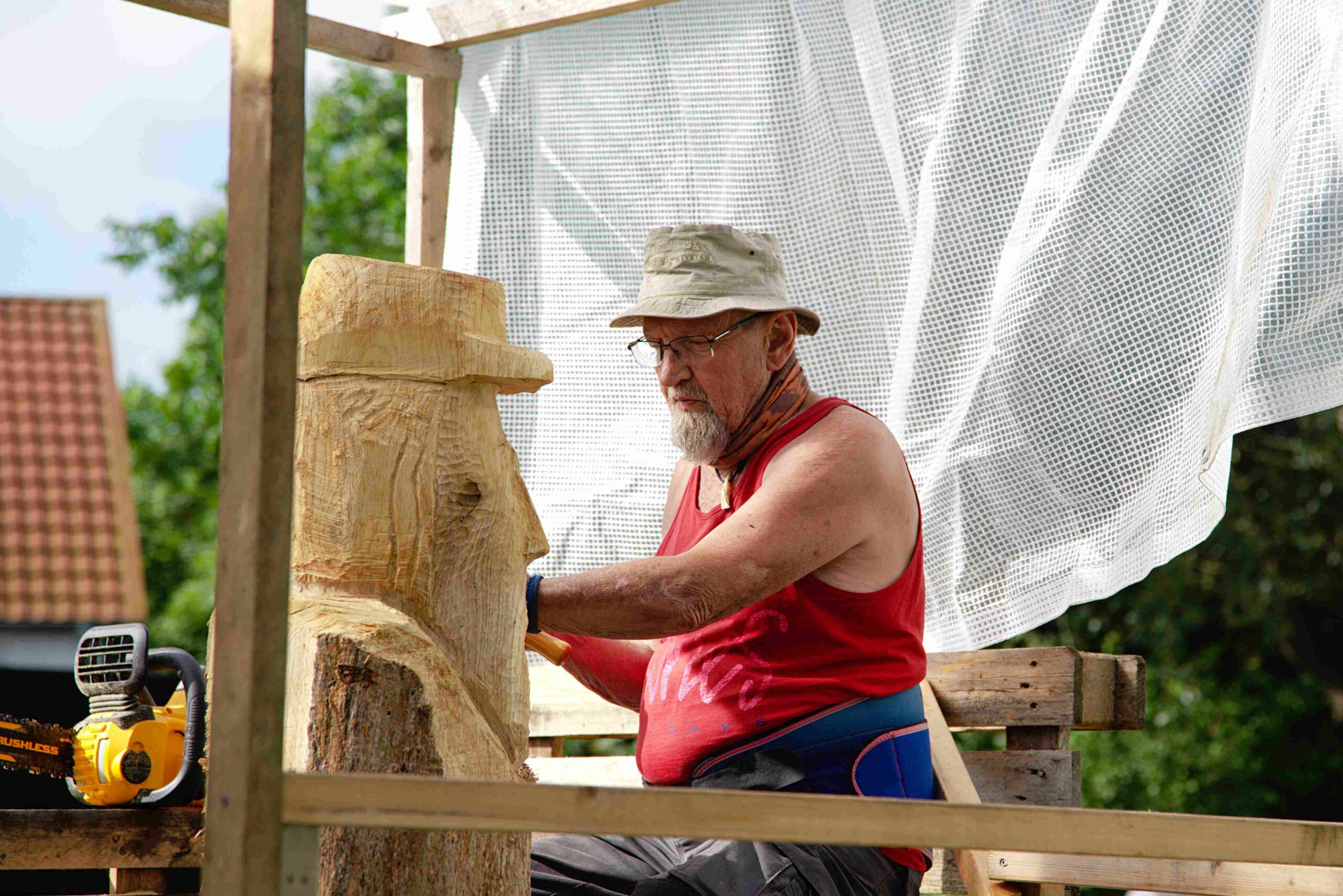 Hovedet med kasket er ved at være på plads- nu følger kroppen med tornyster, gevær samt støvler. – Der kommer rigtig mange forbi og hilser på, fortæller Leifs lillebror – Henning Jakobsen, som ejer det gamle toldsted, hvor et egetræ fra 1958 måtte fjernes og efterlod et stub på stedet.