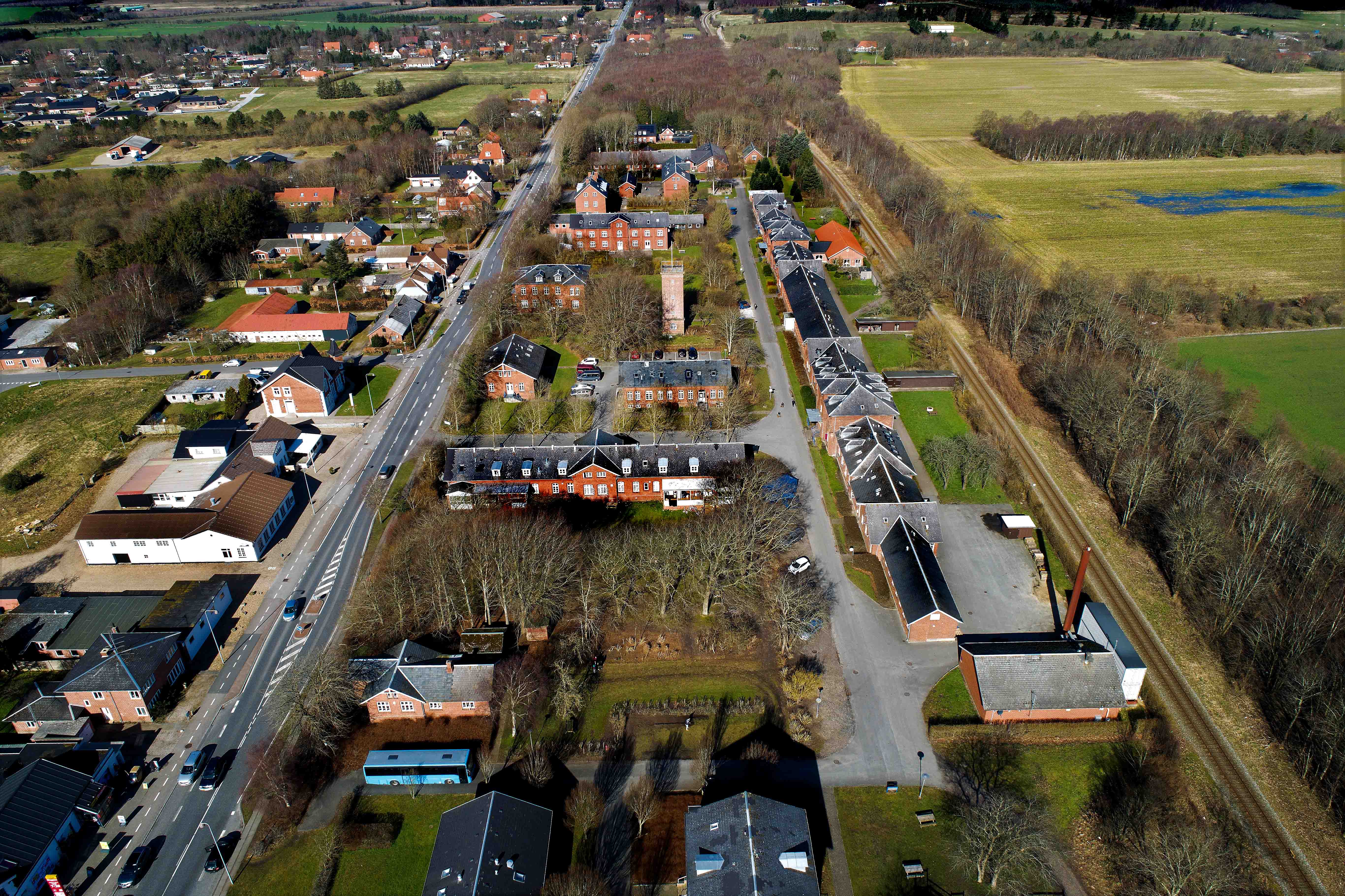 Asylcentret består af rigtig mange bygninger. Dronefotograf Ove Detlevsen har i dag taget billedet fra syd, som viser bygningsmassen beliggende mellem hovedvejen og jernbanen.