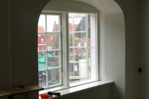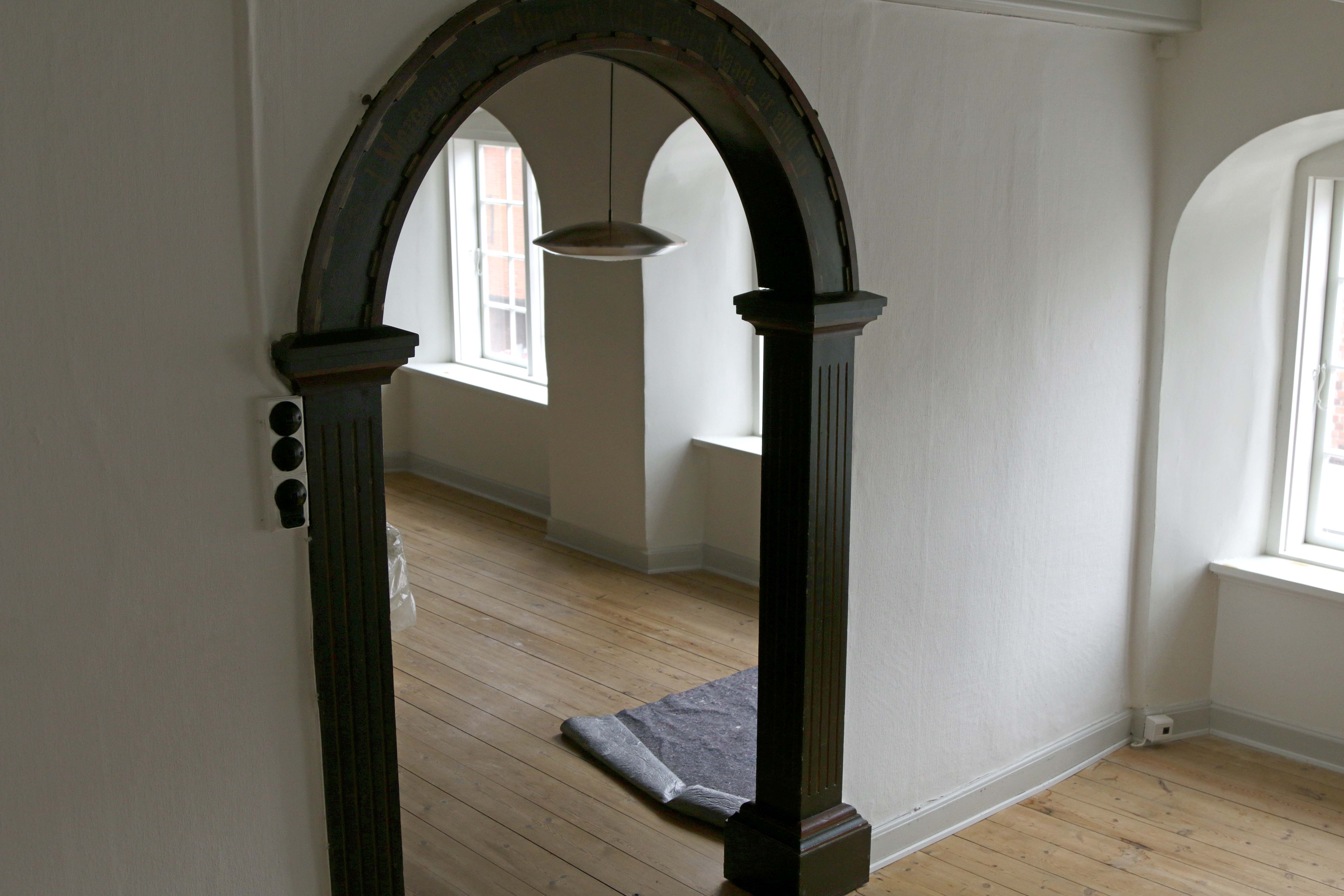 Lejligheden er fra en tid, hvor menneskene ikke var så høje som i dag, så er det slået fast – men loftshøjden i stuerne er dog forholdsvis høj med flotte profilerede gerichter. J En flot og dekorativ rundbue sammenbinder de to stuer med udsigt til Torvet. Her måtte RYK IND´s udsendte bøje sig relativt meget for at komme under!
