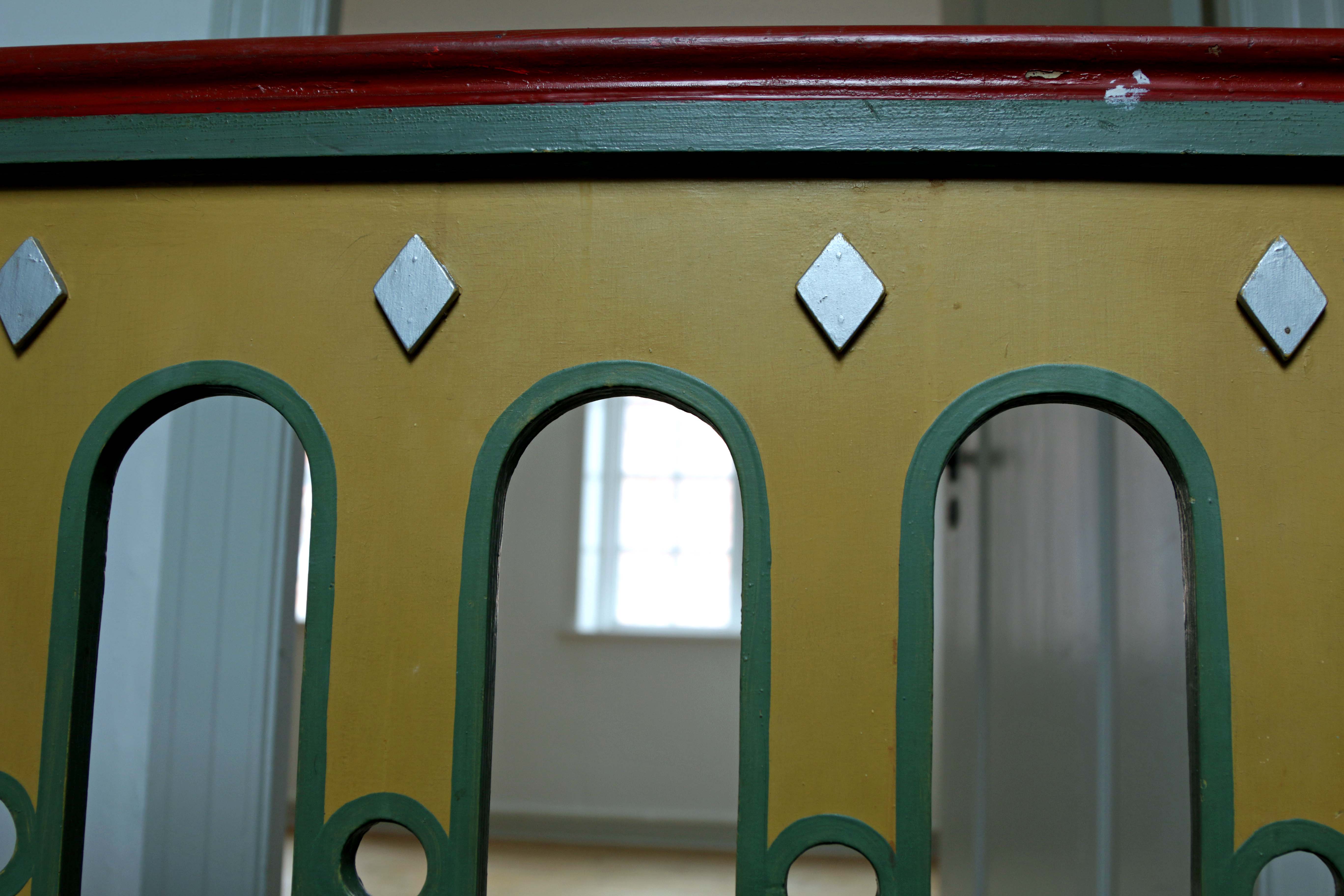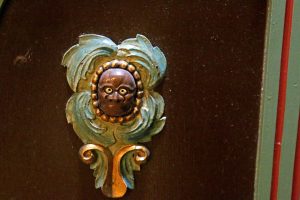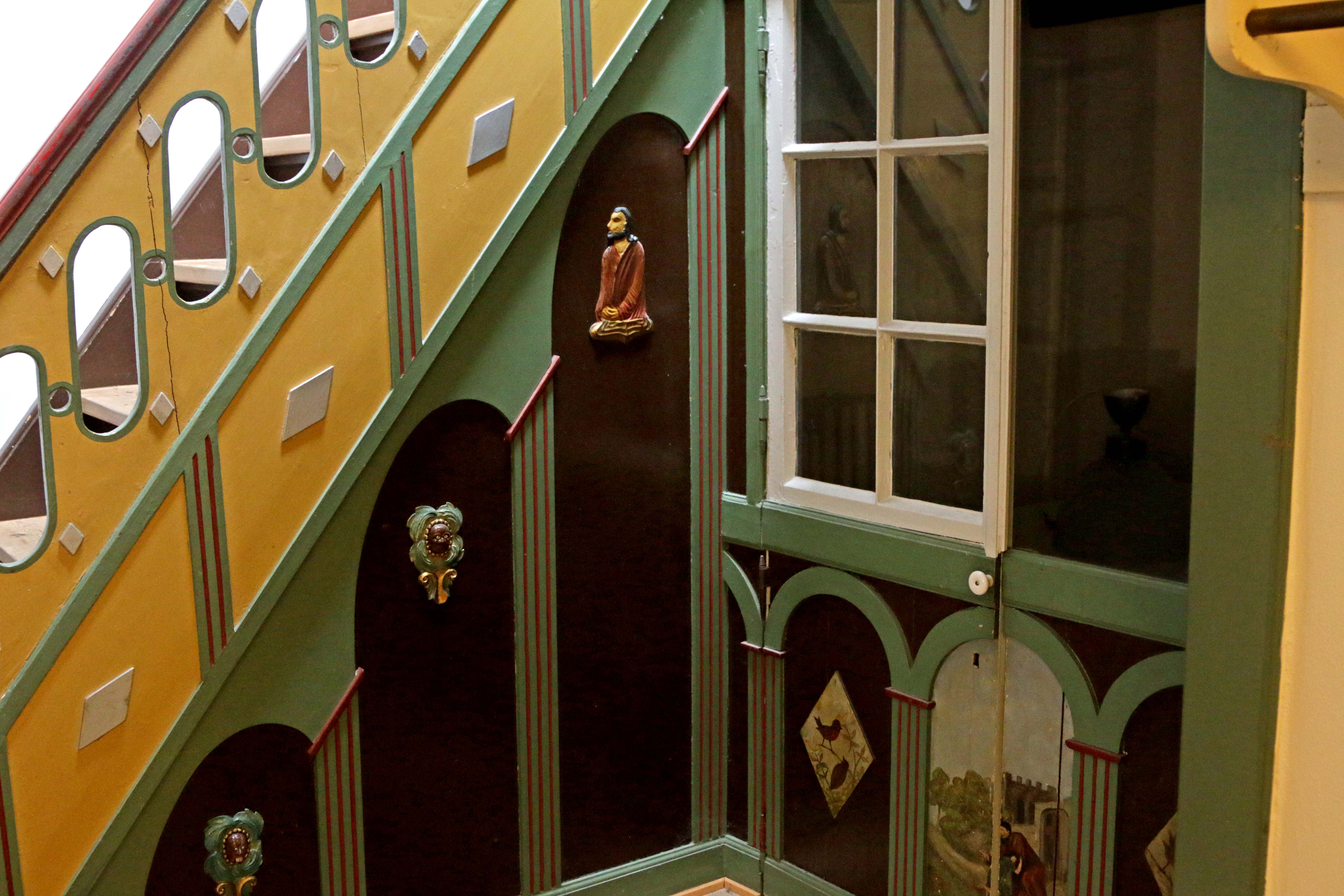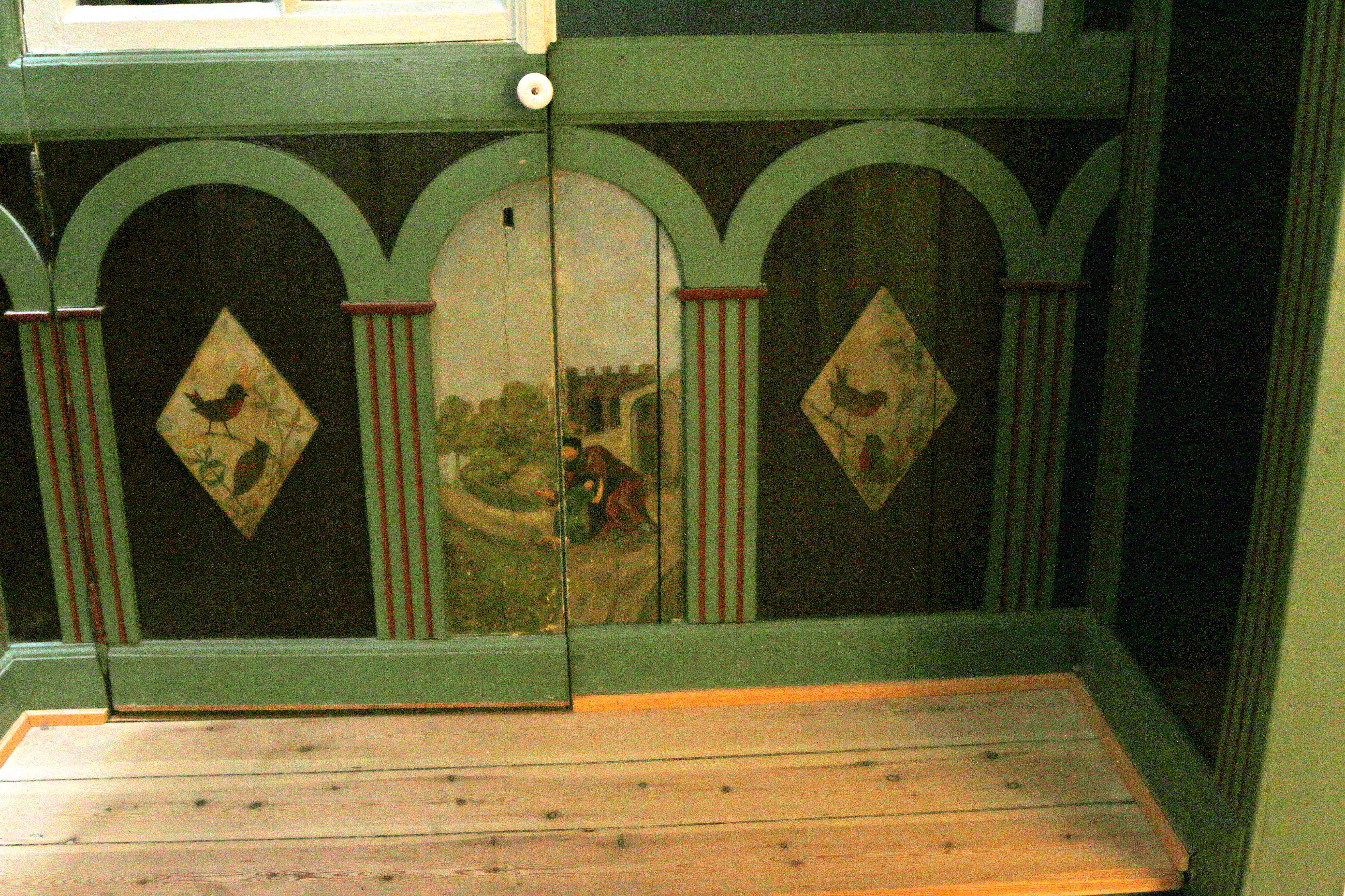 På 1. sals trappeafsats er der en alkove med soveplads – dørene til alkoven har et velbevaret motiv, men det der fanger blikket først er nu 3 figurer på siden af trappen til 2. sal – trappens værn.