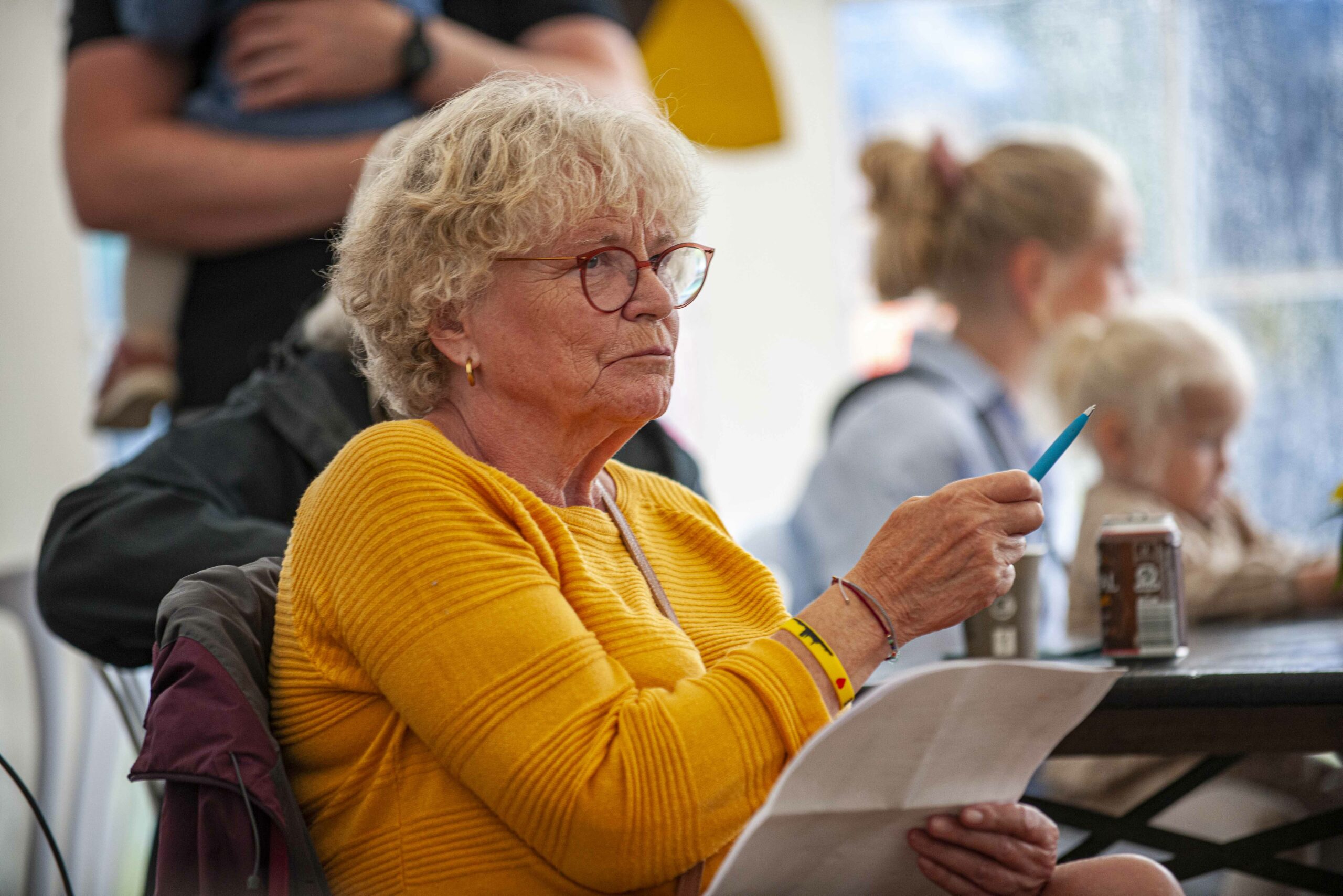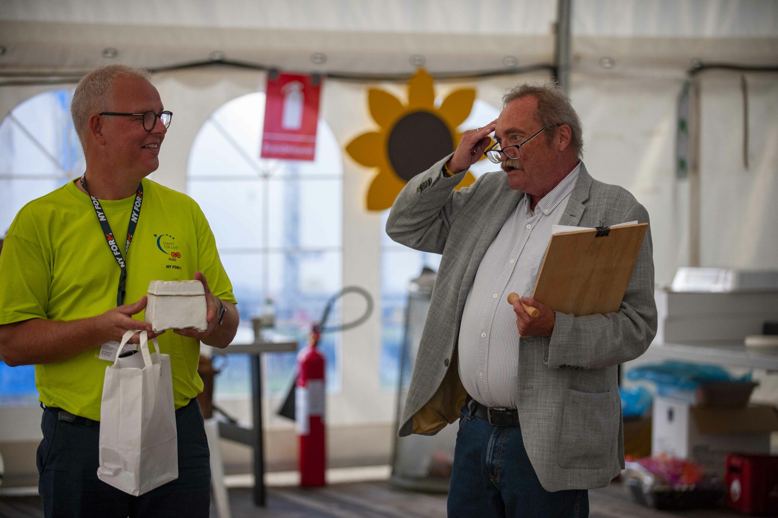 Et regn- og tordenvejr fik arrangørerne til at trække auktionen ind i det store telt på pladsen. Selv om Mogens Vinther, tidligere Ribe advokat, normalt styrer begivenhederne, havde ”vikaren” Claus Rudolf Hansen, fuld kontrol over publikum. Det skortede ikke på morsomheder, der fik smilet frem, selv om formålet med indsamlingen er mere dyster. Han gjorde det godt.