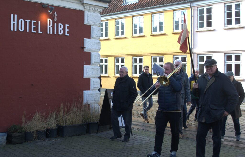 Bænkene, der er skænket af Sikrings Center Syd, blev sat op under klingende basunspil leveret af Søren, og efter bænkene var kommet på plads under overværelse af en snes mennesker, gik selskabet med musik i spidsen til Hotel Ribe, hvor hotellets lækre stegt flæsk blev indtaget mens snakken gik lystigt i et par timer.