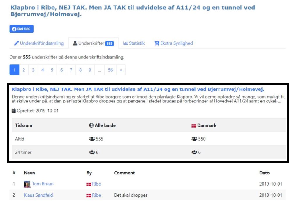 Der er noget, som ikke helt passer. Klaus Sandfeld har lavet opslag om, at 1100 har skrevet under på hans underskriftsindsamling ”Nej tak til klapbroen, men da RYK IND RIBE mandag formiddag besøgte hjemmesiden, var der opgivet tallet: 555. Men der er sikkert en forklaring.