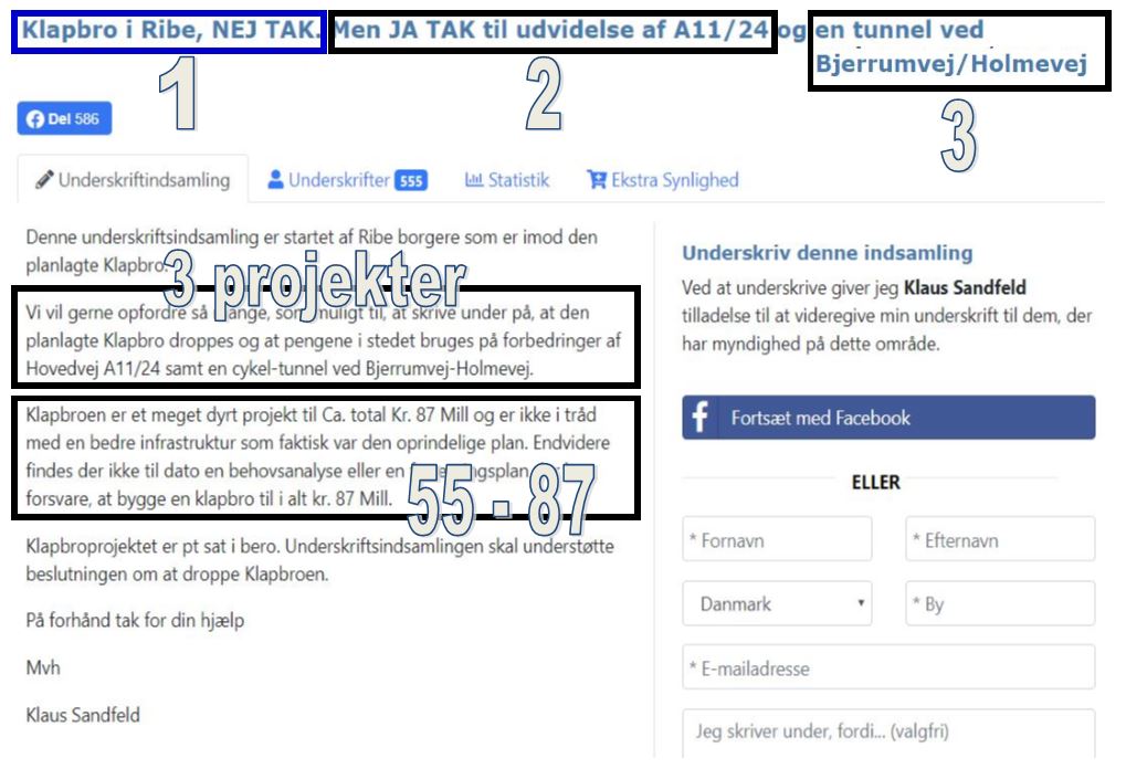 For det første indeholder overskriften flere elementer – Klapbro i Ribe, NEJ TAK. Men JA TAK til udvidelse af A11/24 og en tunnel ved Bjerrumvej / Holmevej. Det er fint nok at lave en underskriftsindsamling imod klapbroen, men at koble den sammen med et JA TAK til andre projekter hænger ikke sammen – og sender et signal om, at disse er inden for rækkevidde. Der er her tale om tre projekter uafhængige projekter.