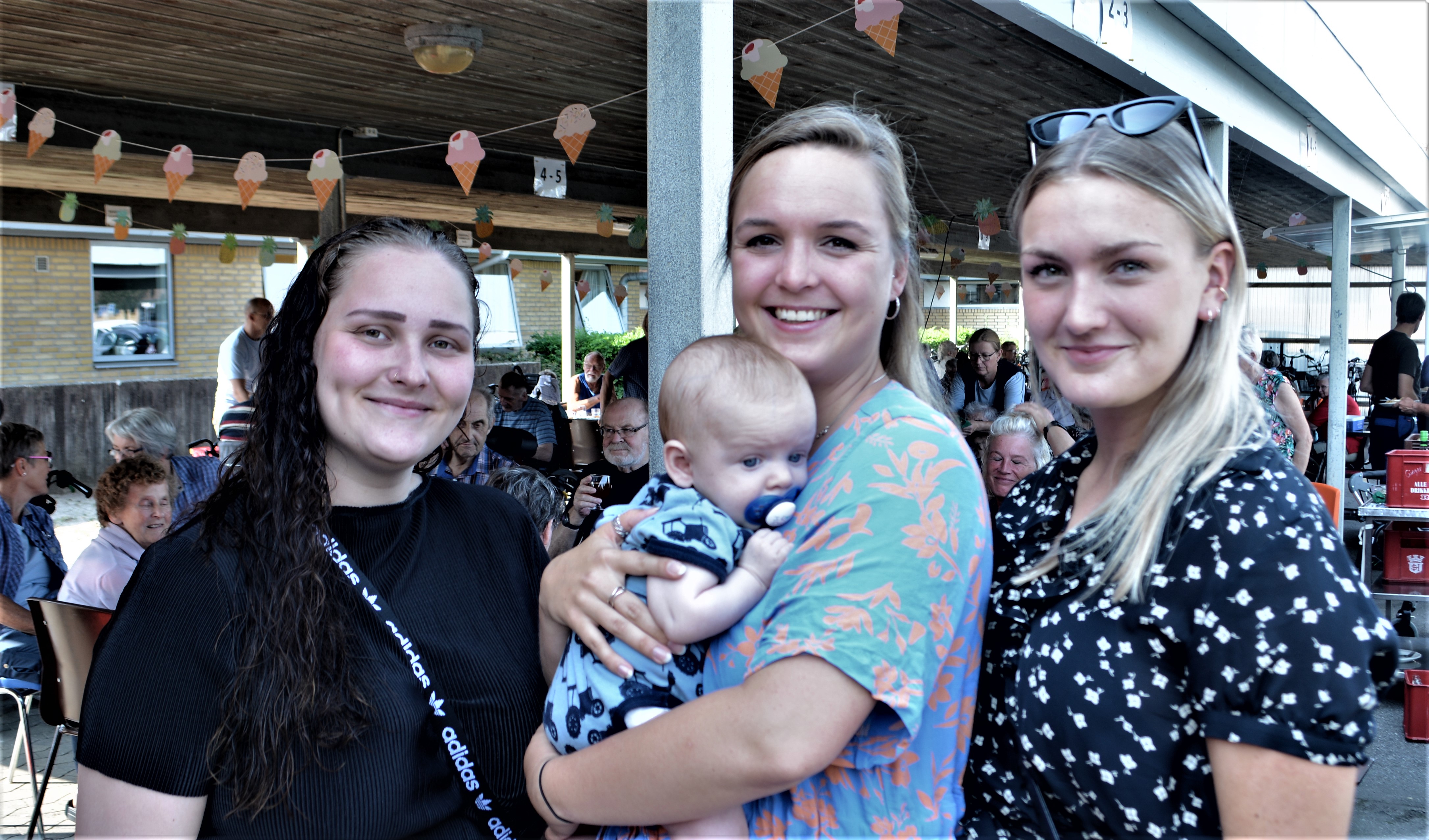 De tre piger, der har sørget for pengene. Marie Pahuus, Emma Olsen med den 3 1/2 måneder gamle søn og Signe Thyssen