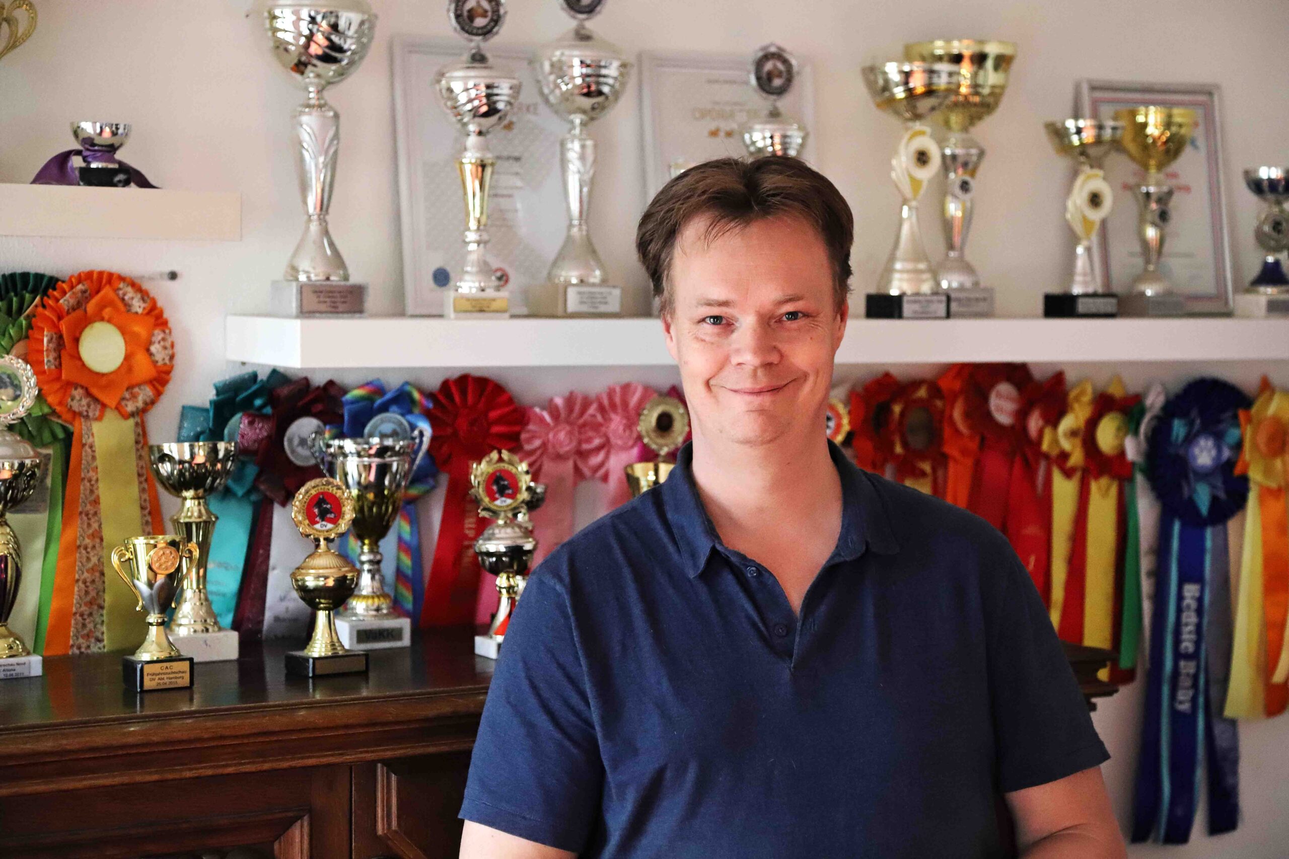 Michael viser her stolt de mange præmier, familien har vundet med Dobermann hundene på udstillinger rundt i Europa