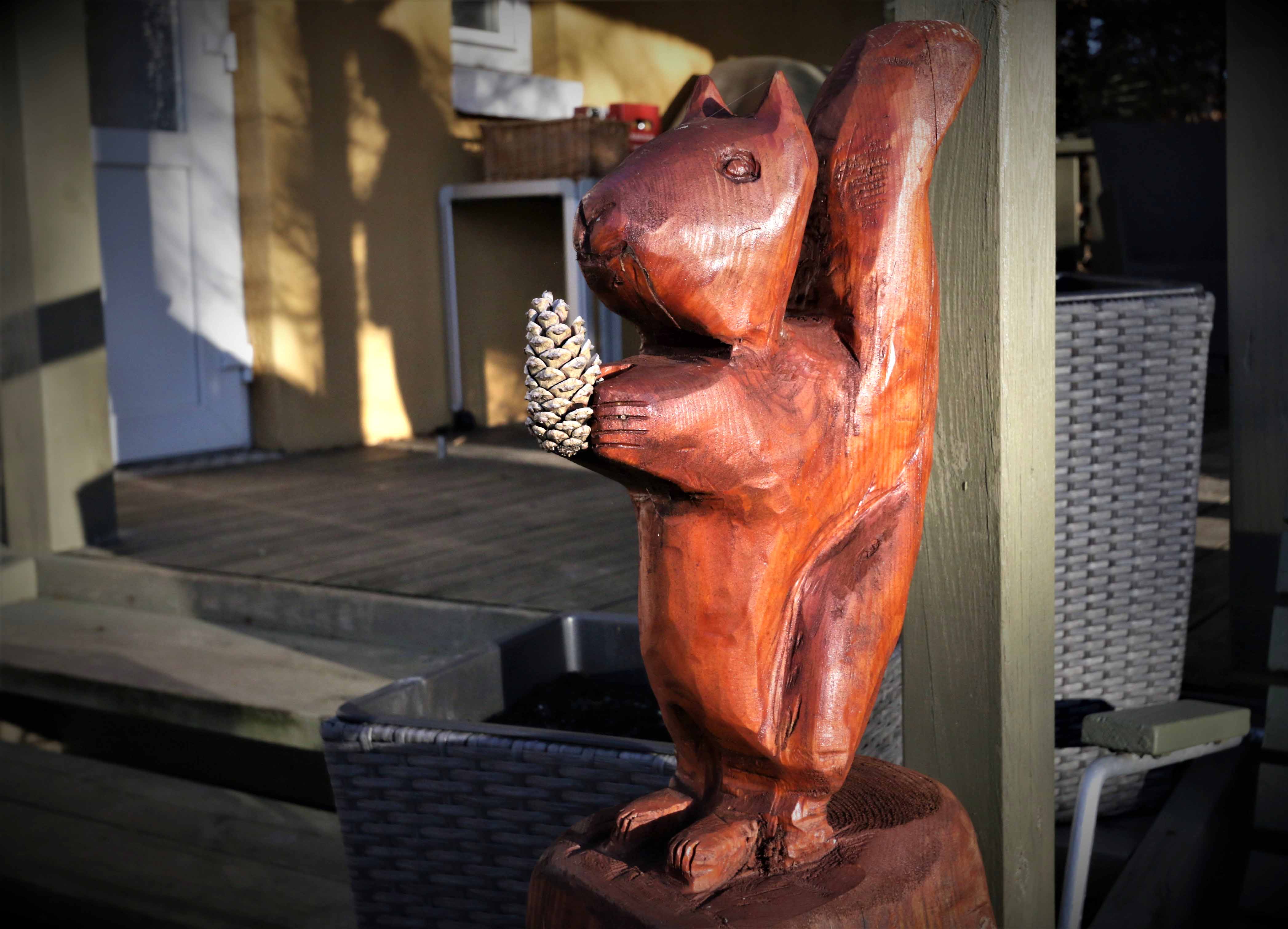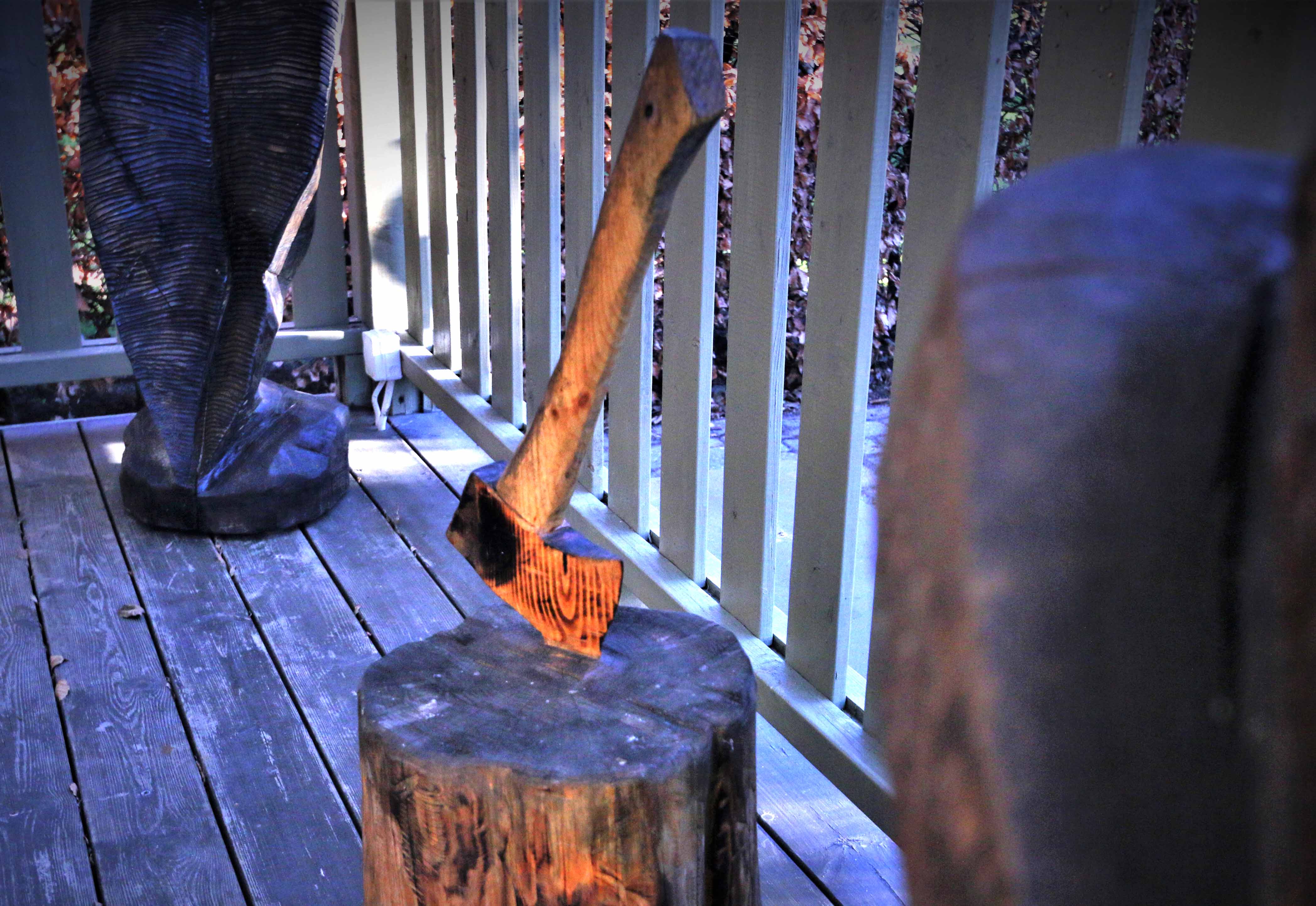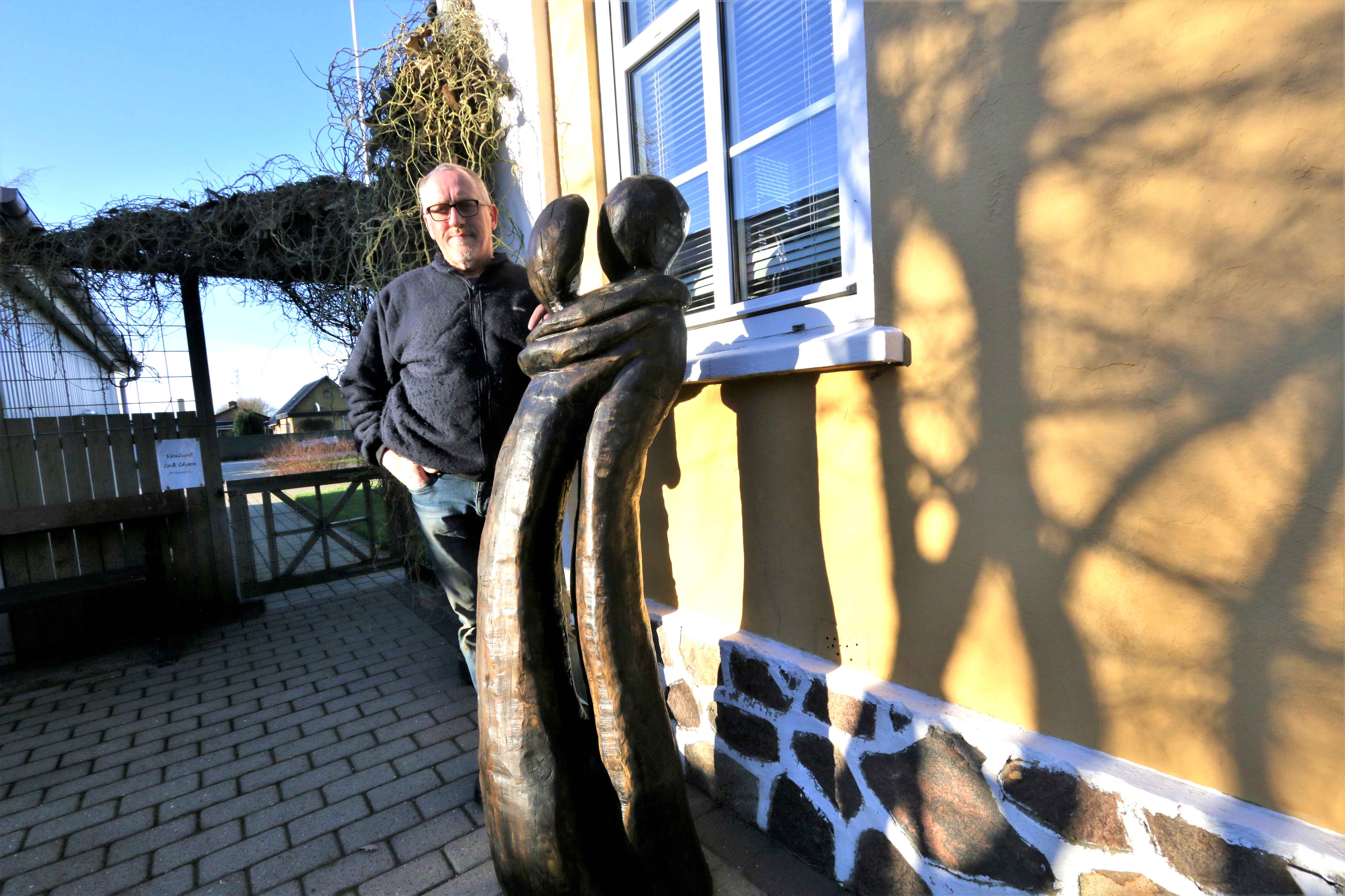 En masse studier på YouTube – indkøb af de rigtige værktøjer og masser af tålmodighed – har været med til at skabe 10 flotte værker, som alle står placeret på ejendommen. Især øksen, der sidder i kævlen, er unik, men også kæresteparret har kvalitet.