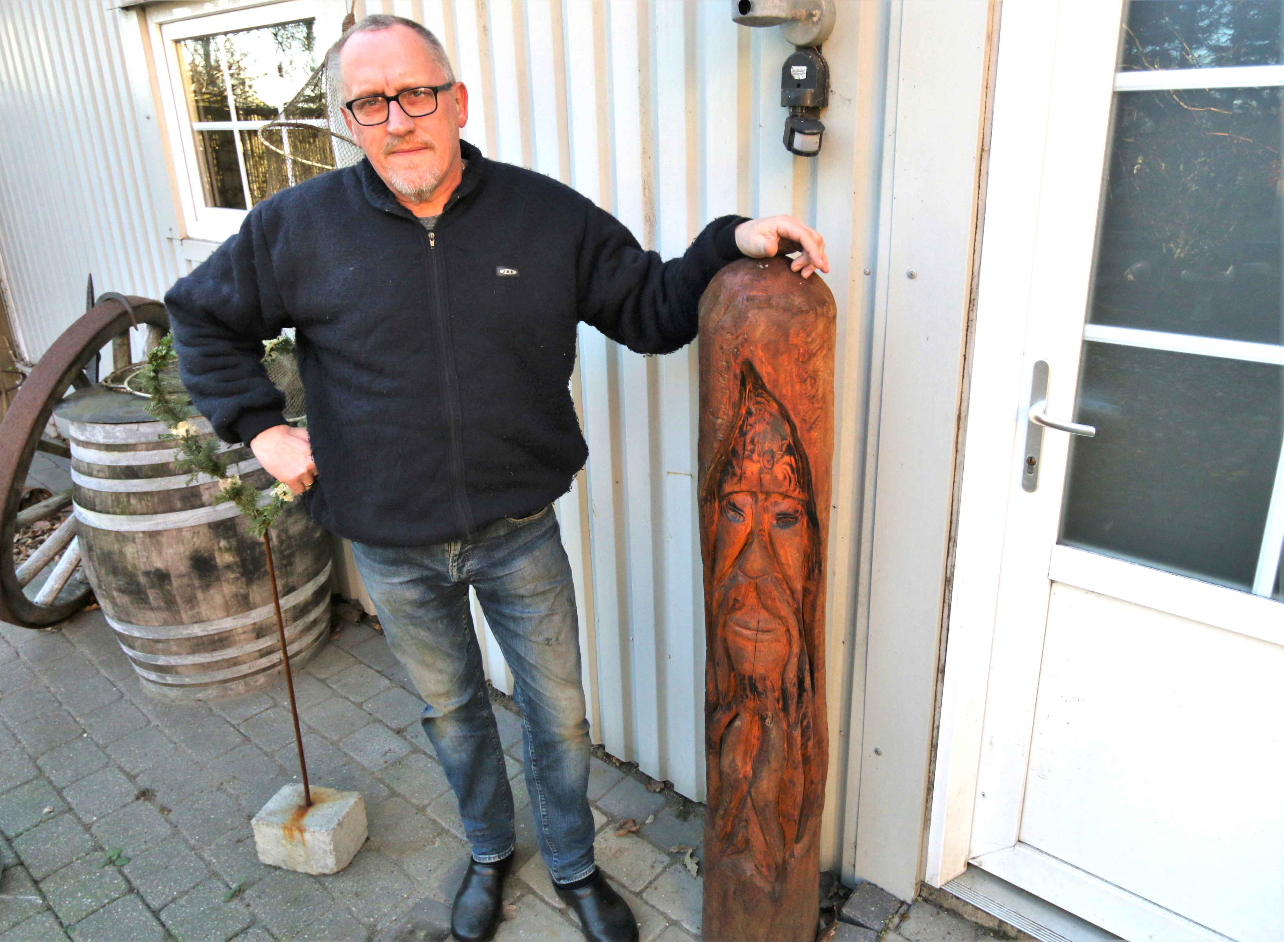 En masse studier på YouTube – indkøb af de rigtige værktøjer og masser af tålmodighed – har været med til at skabe 10 flotte værker, som alle står placeret på ejendommen. Især øksen, der sidder i kævlen, er unik, men også kæresteparret har kvalitet.