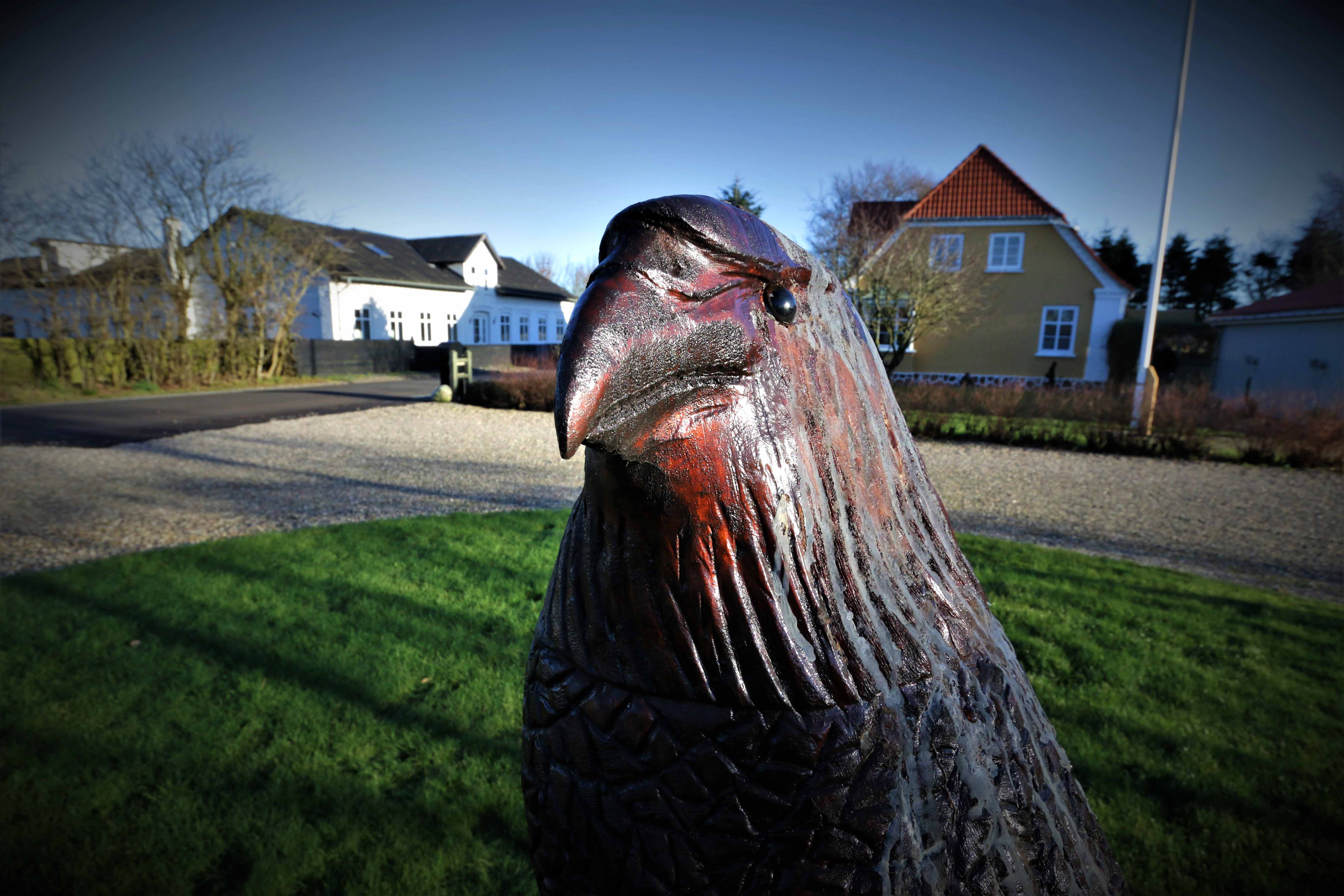 Et skarpt blik fra en rovfugl holder øje med dig, når du nærmer dig Ø. Åbølling Vej 24 – smukt udskåret og formet i træ. Det er husets ejer – Bent Peter Løbner – som har skabt det unikke kunstværk UDEN uddannelse i at skabe træskulpturer.