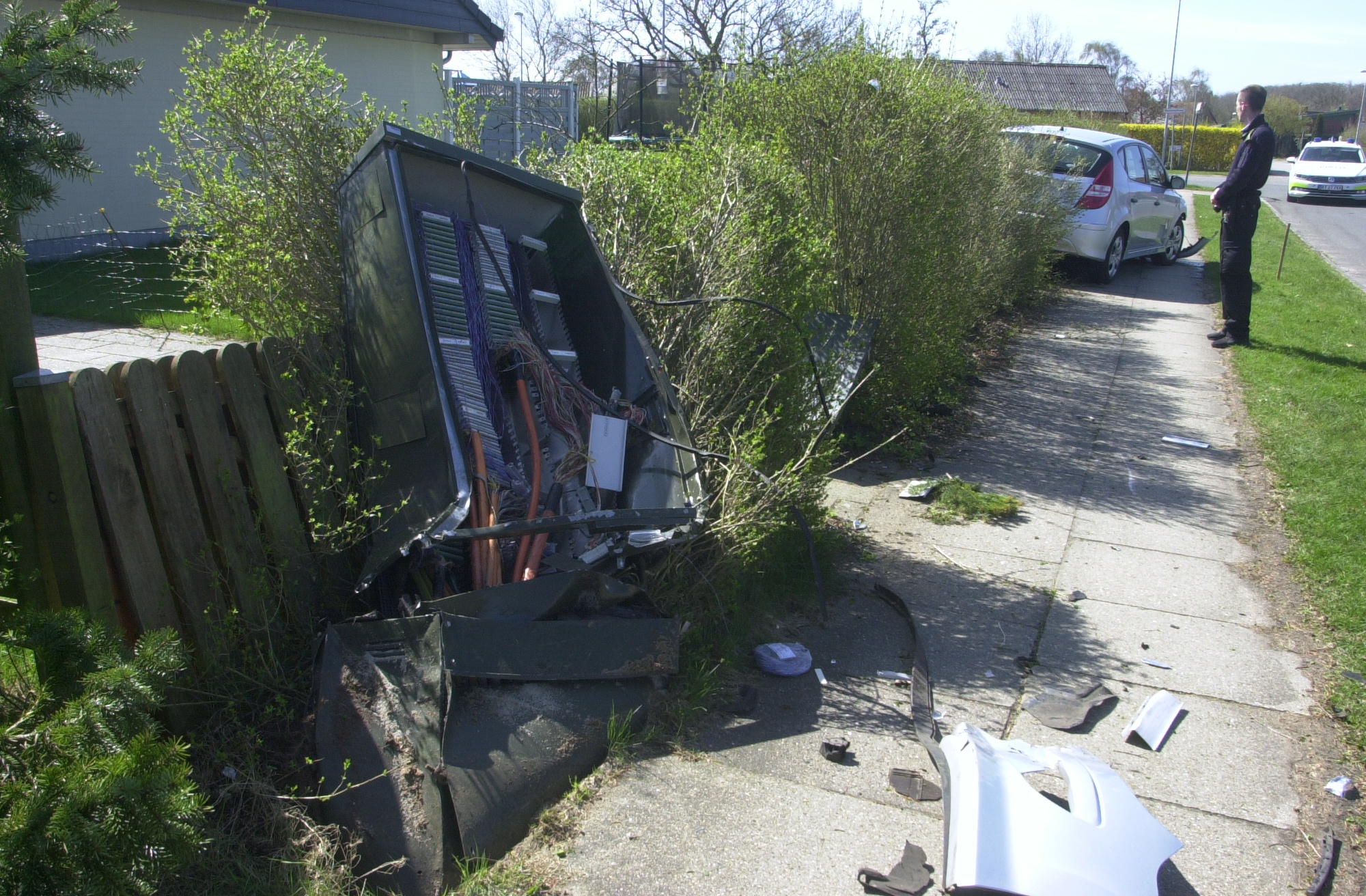 Heldigvis var det kun døde ting, det gik ud over, da en bilist mandag middag (23. april) mistede herredømmet over sin bil på Skindermarksvej i Ribe. Bilen kørte tværs ind over fortovet i modsatte side af køreretningen, og den torpederede et stort telefonskab, ligesom den raserede en hæk, inden den holdt stille.