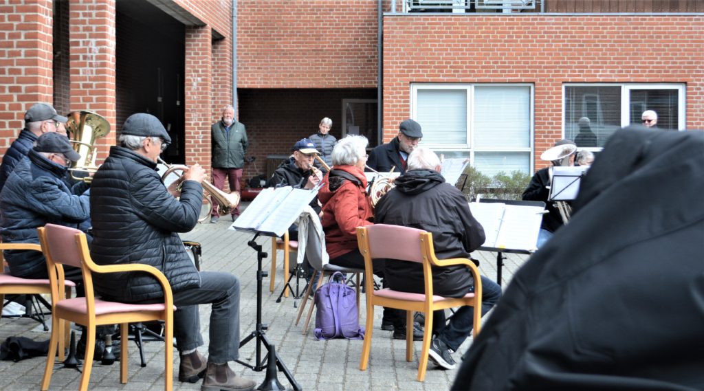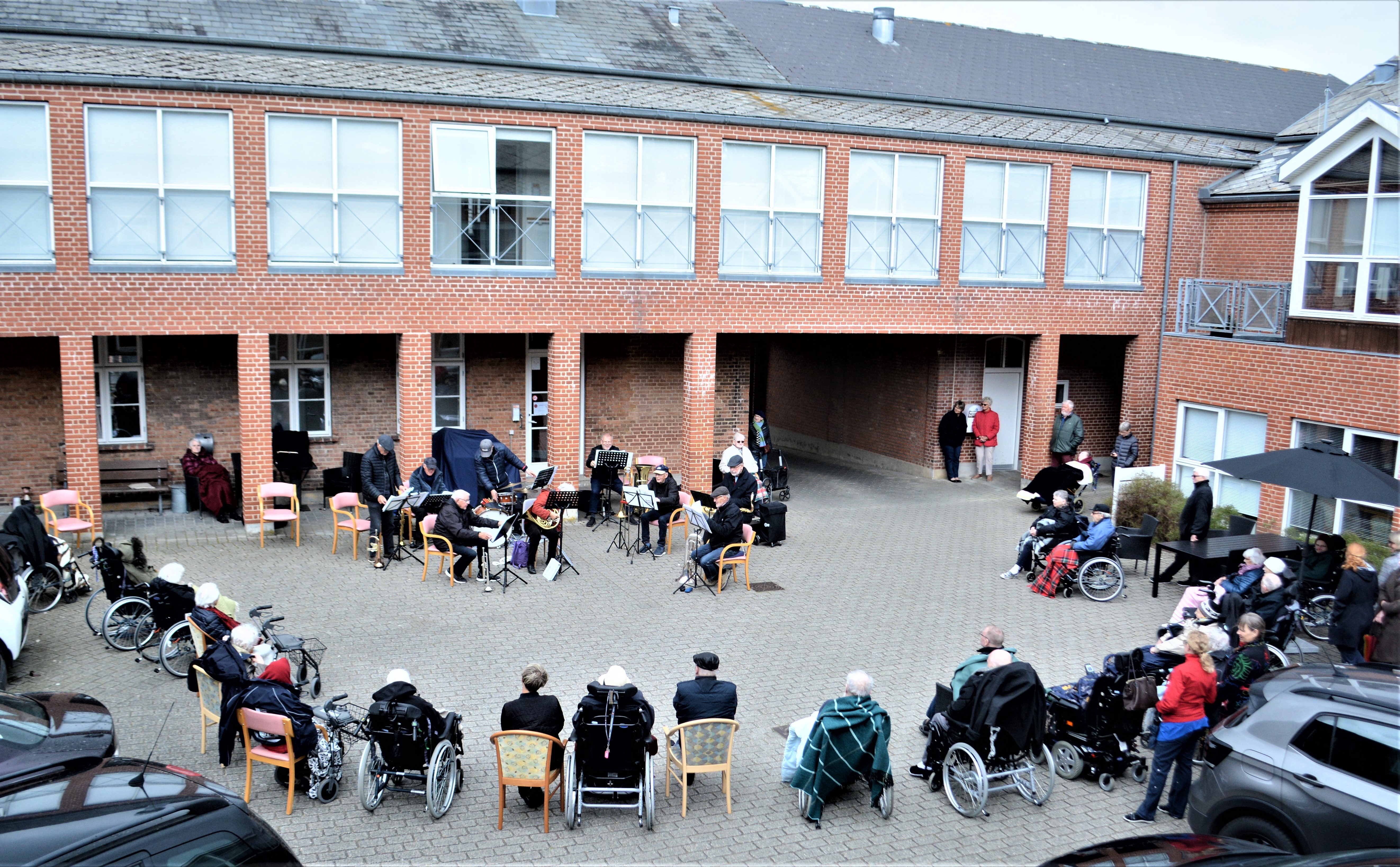 I disse corona-tider holdes sådanne koncerter udendørs, og bygen kom, da orkesteret underholdt på Dagmargården. Der blev hurtigt slået parasoller op, fremskaffet paraplyer og regntøj, og så kunne beboerne nyde de livlige toner i gården. Musikken spændte vidt fra Københavnermarch til I skovens dybe stille ro. Der var også dansemusik ind i mellem, så der blev rokket og danset i takt til musikken.