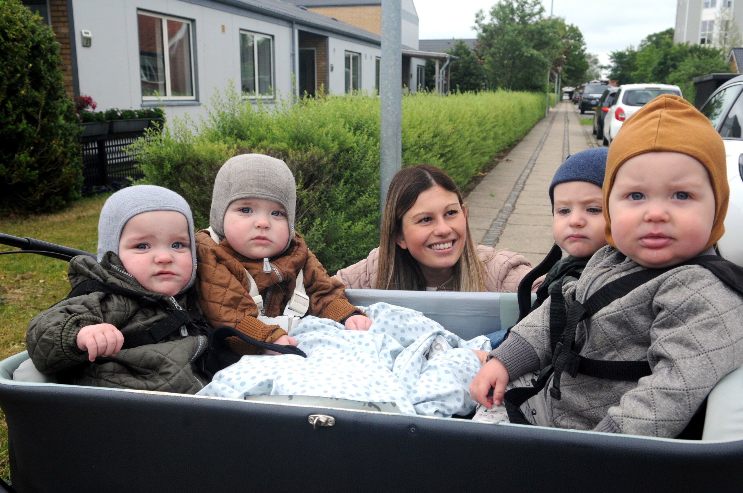 Fire børn fra storpasningsordningen Villa Villa Kulla på Bordingsvej ventede spændt på Sofia, som der skulle vinkes til. Fra venstre er det Albert og Oskar. Pædagog Duddi Lauridsen i midten og til højre inderst, Matheo og yderst Oliver. Storpasningsordningen – Et mærkeligt navn, men det hedder det altså. Stordagpleje havde været fint at kalde det, for det er det det er. Duddi Lauridsen og Tina Lauridsen har ti børn til sammen.