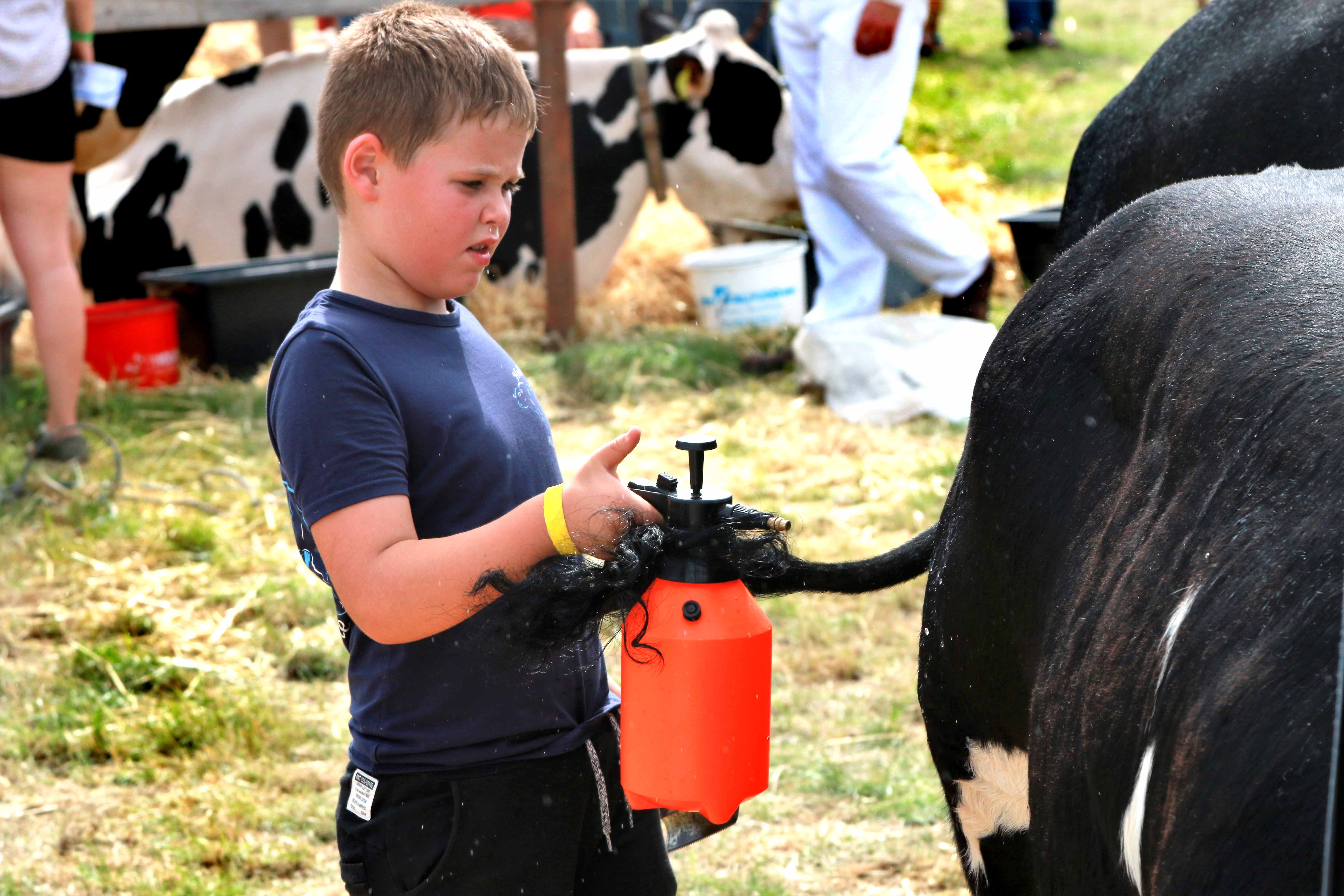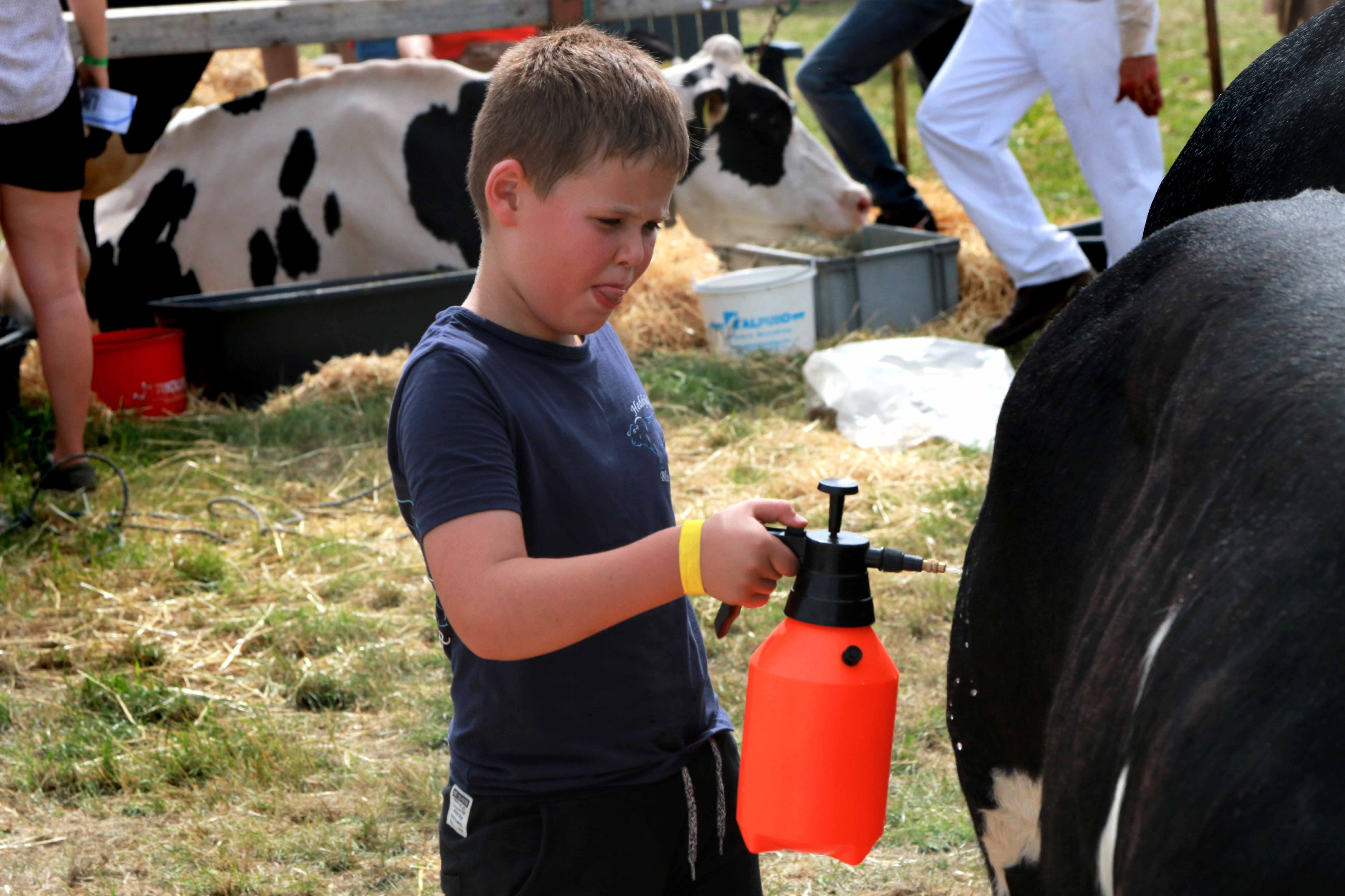 Både i børnedyrskuet og “det store” dyrskue var der mange opgaver, som skulle løses, inden dyrene skulle vises frem foran dommerne. Og børnene var aktive – se bare drengen, som med sikker hånd sprøjter vand på koen – som så uventet svinger med halen, hvorved en del vand rammer tilbage på drengen.