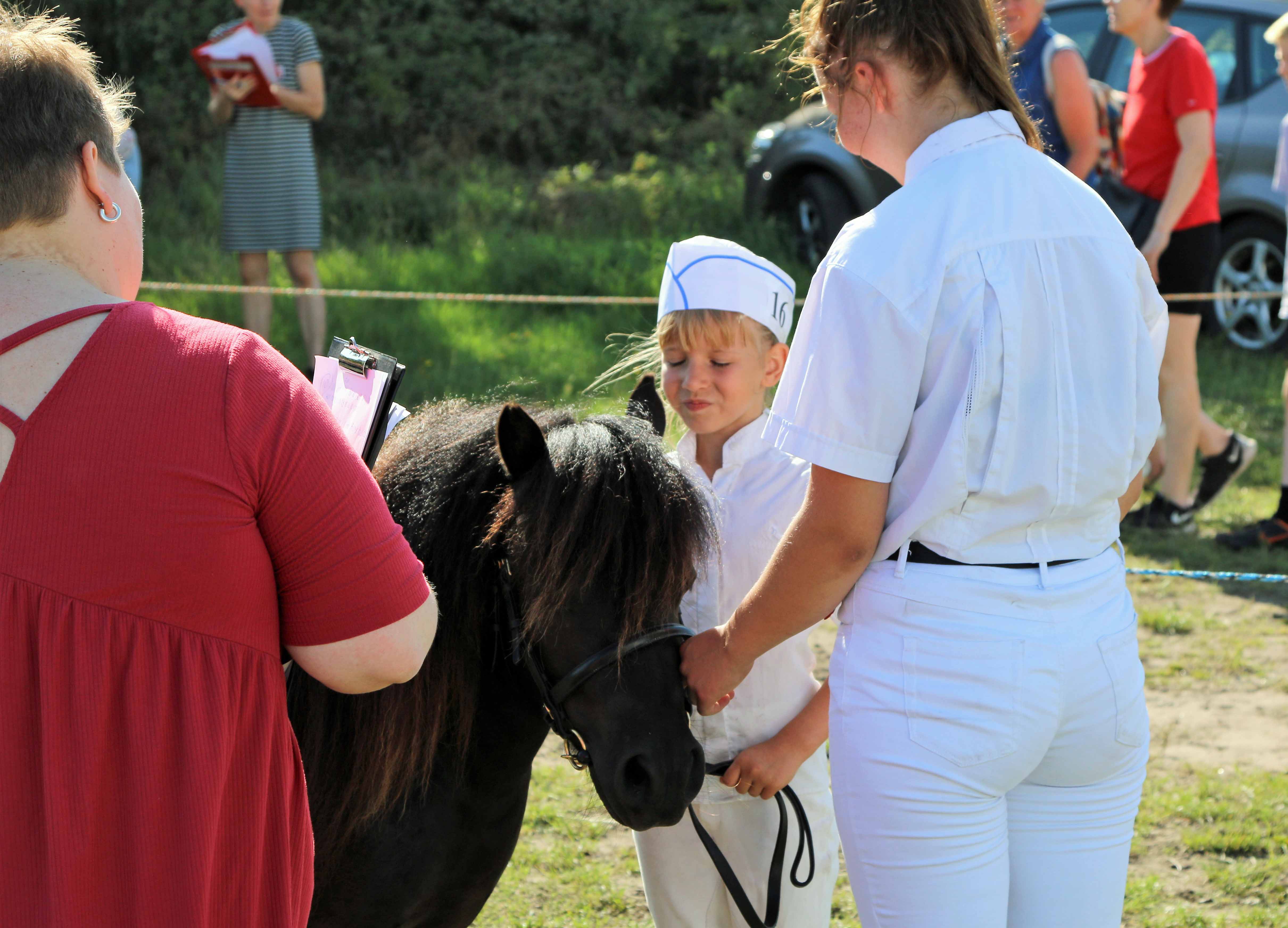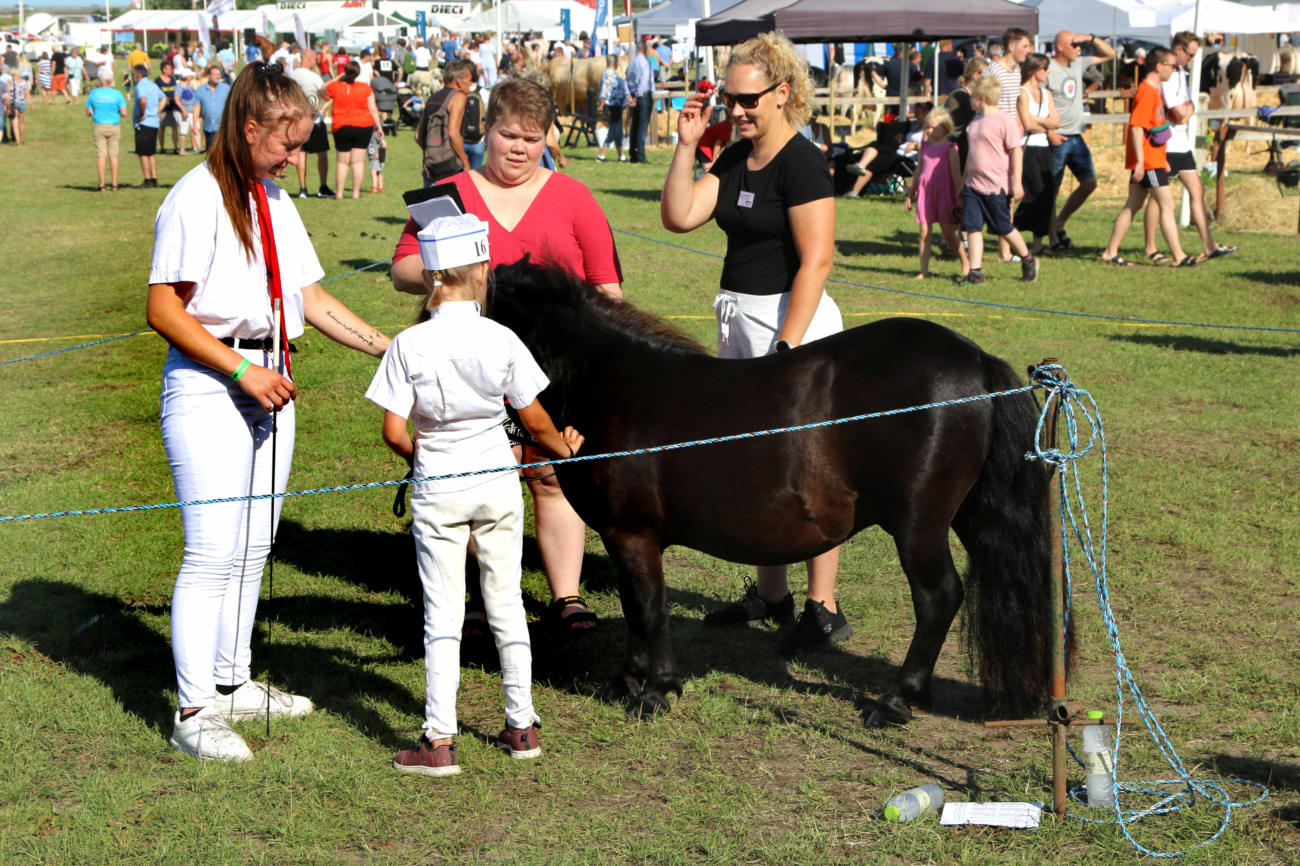 Eller Sofia, som har gjort ponyen Pondus klar – og her står foran dommerne. Sofia skal tænke sig godt om, når dommerne spørger ind til hestens anatomi og pleje – men hun klarer det godt, så forældrene, der står uden for ringen kan ånde lettet op.