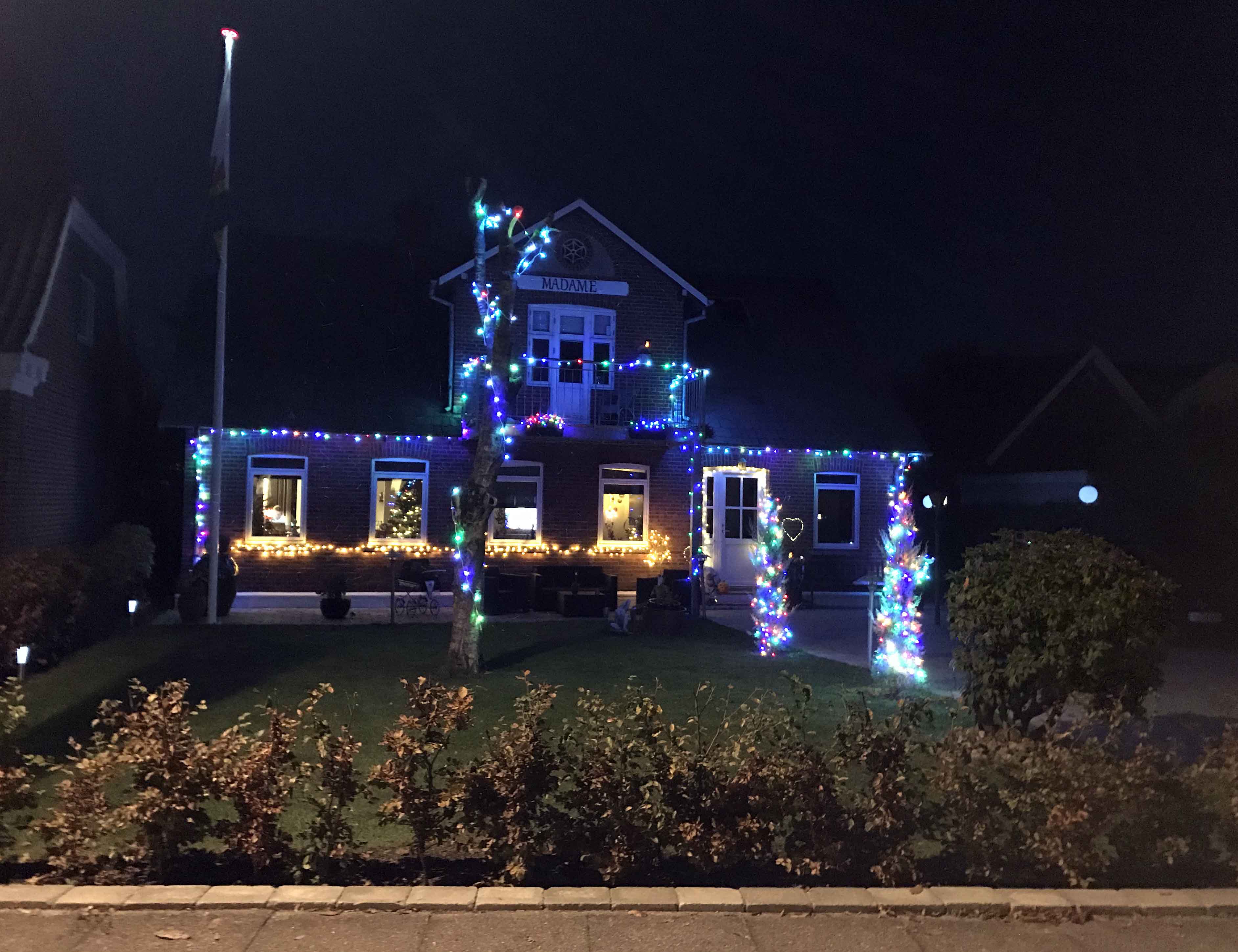I know who you are Madame. Sådan lyder den kendte sang fra Big Fat Snake, og Madame er også navnet på huset på Tangevej hvor Mogens Schmidt Hansen bor. I villaen havde Mogens` mor damefrisørsalon, deraf sikkert navnet på huset. Huset og haven er flot oplyst i mange farver, og det er bestemt ikke kedeligt.