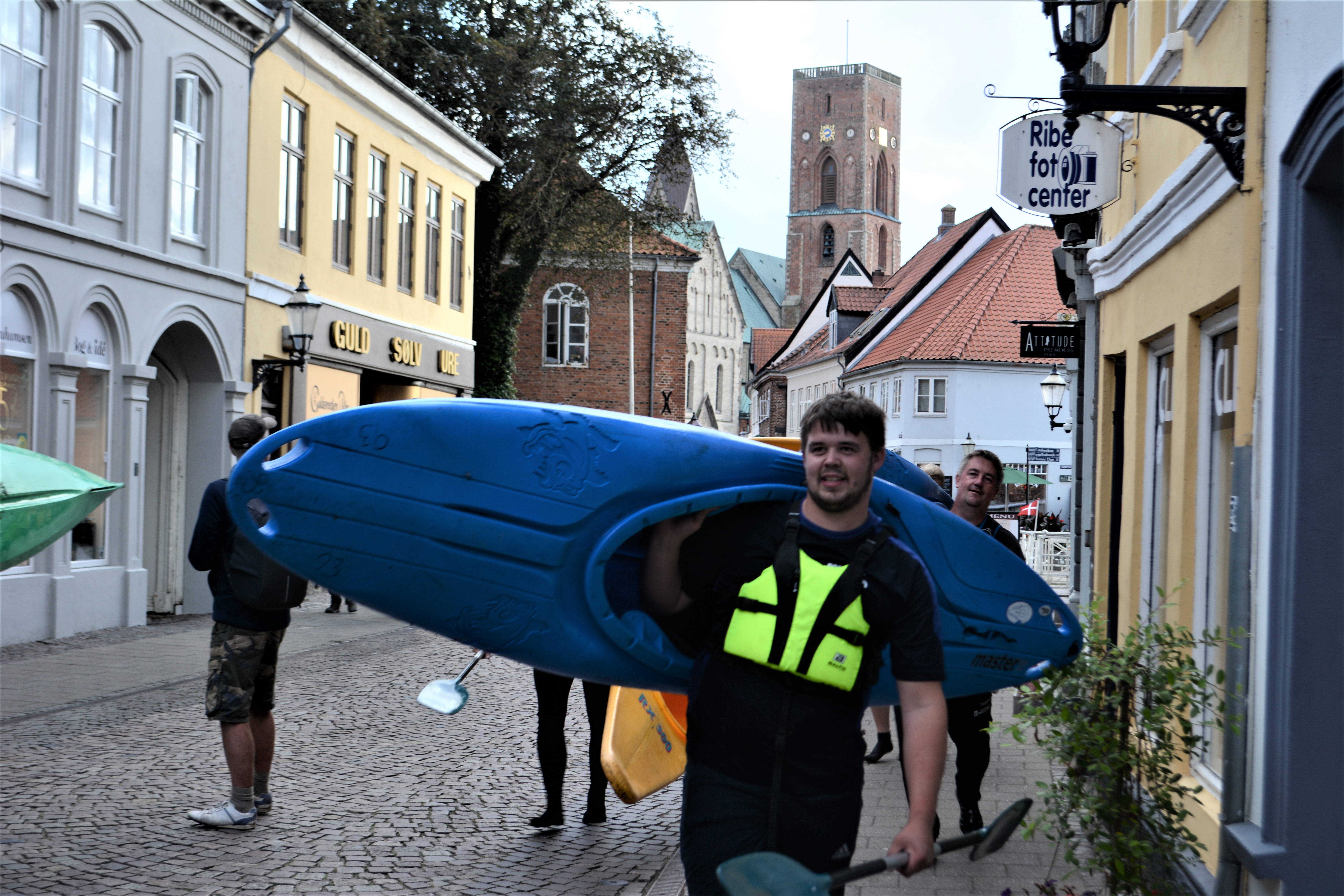 Brandmændene skulle som led i en øvelse sejle i kajakker på Ribe Å og blandt bære dem gennem gågaden for at komme forbi sluserne i midtbyen.