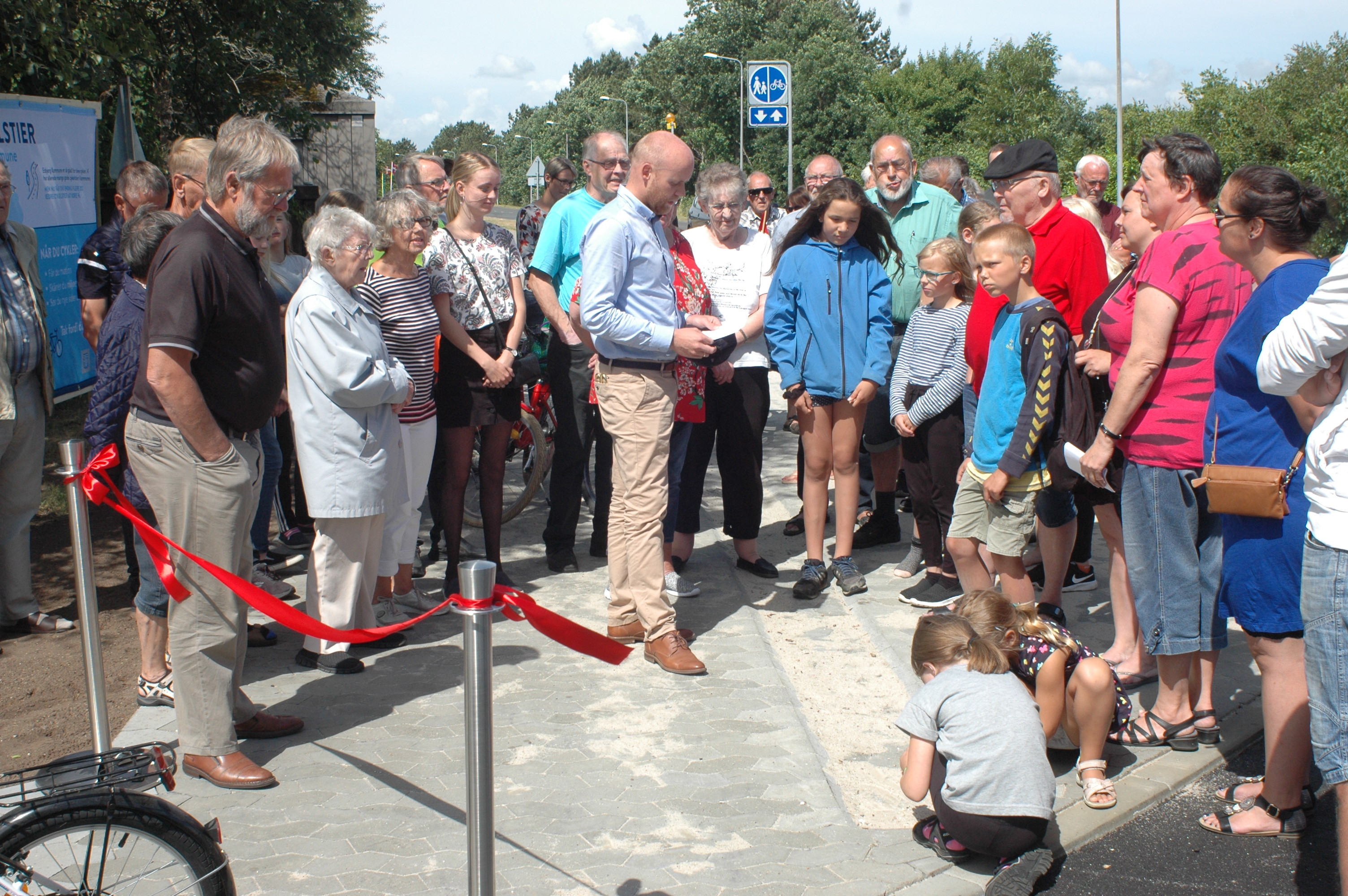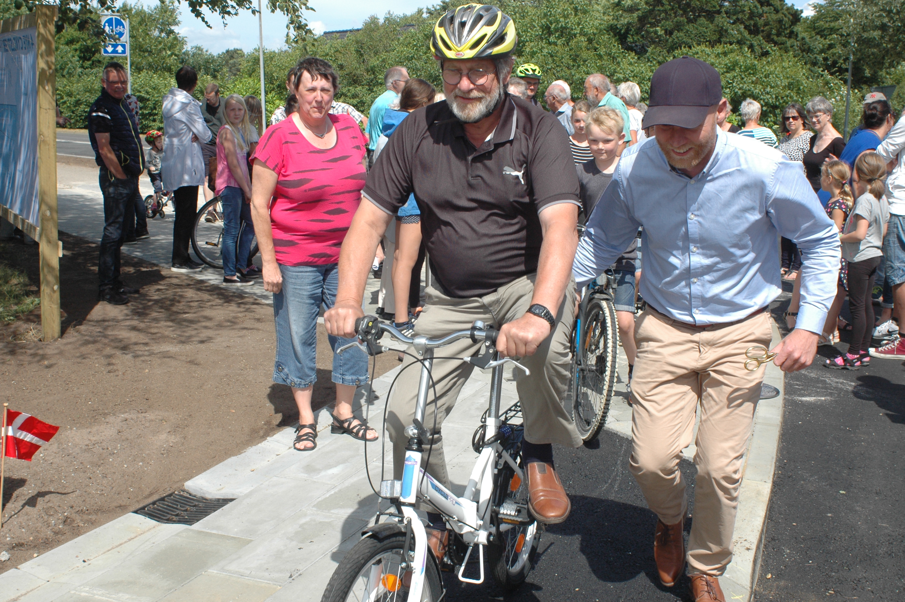 Og så kunne cyklisterne tage stien i brug. Henning Ravn blev skubbet i gang af Søren Heide Lambertsen, og derefter fulgte store og små hen til de ventende kagebord længere ude af vejen.