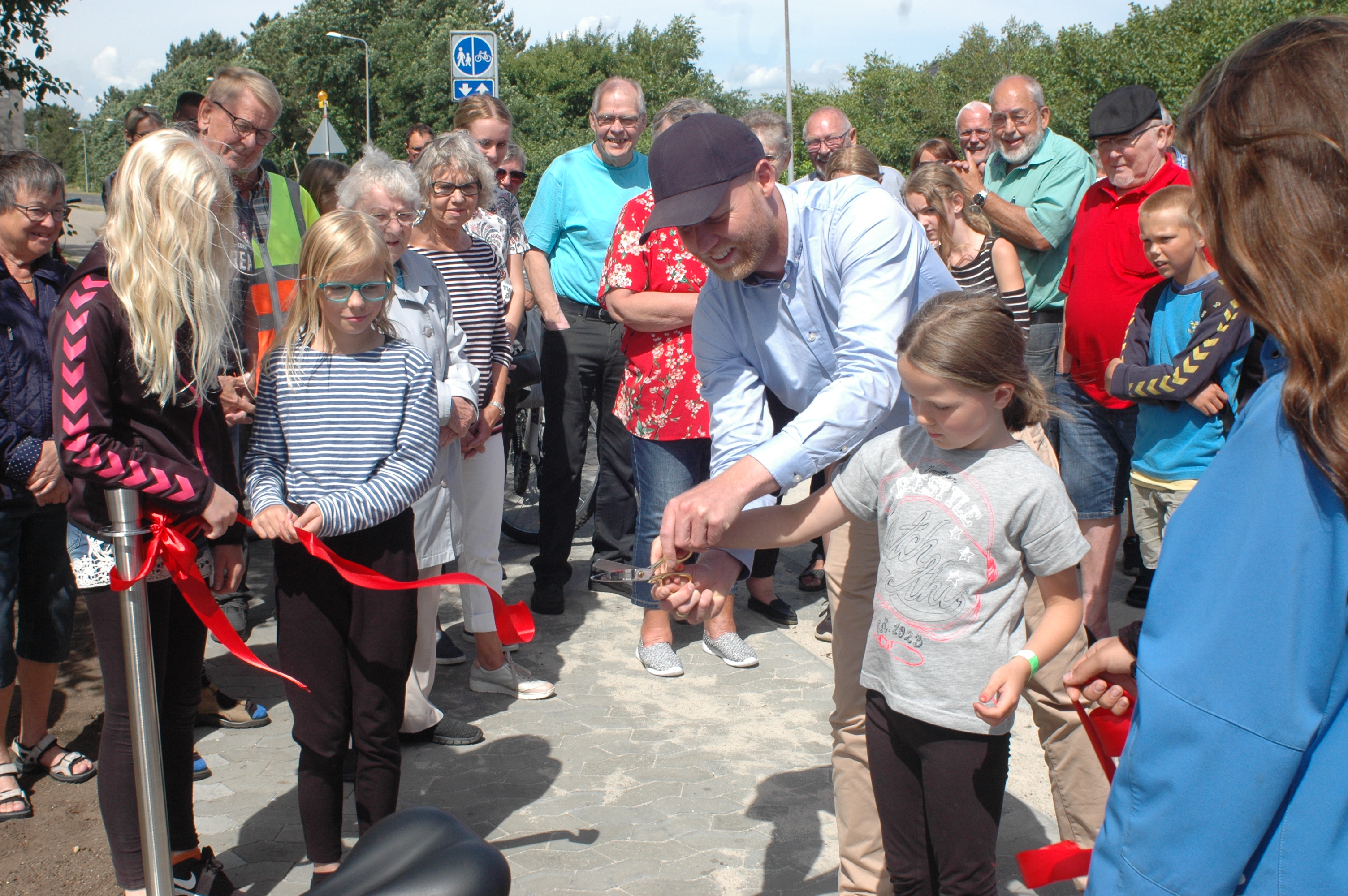 Og så fik fire lokale piger til opgave at klippe den røde snor. Saksen var åbenbart ikke for skarp, og næsten symbolsk trak det lidt ud – men med hjælp fra udvalgsformanden endte det med en overklippet snor.