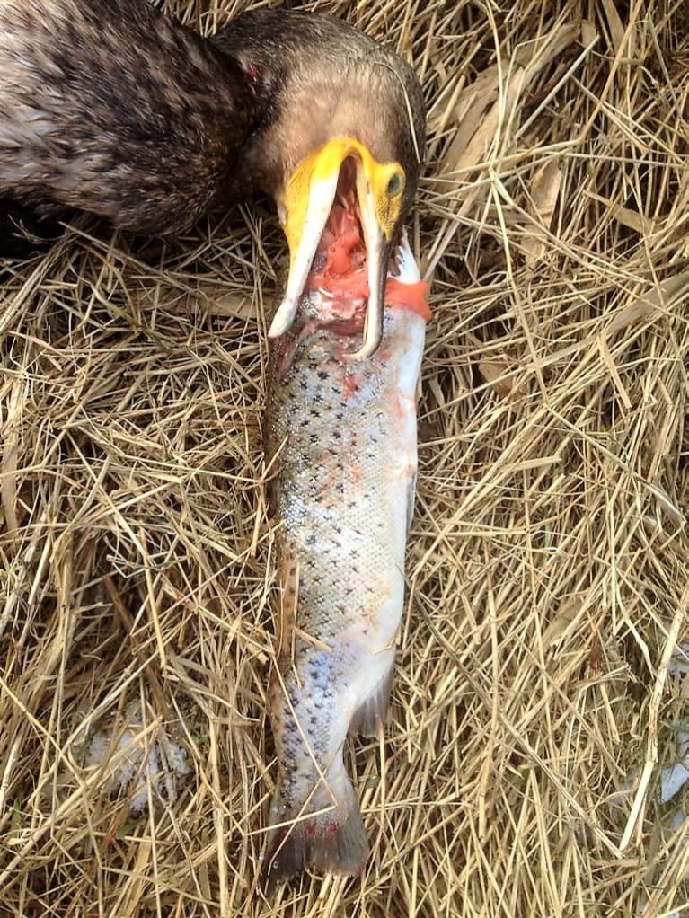 Da snæblen ikke må fiskes / tages op ad vandet – så har vi fået lov til at gengive et billede, som Gert Mikkelsen har taget af en ørred fanget af en skarv.