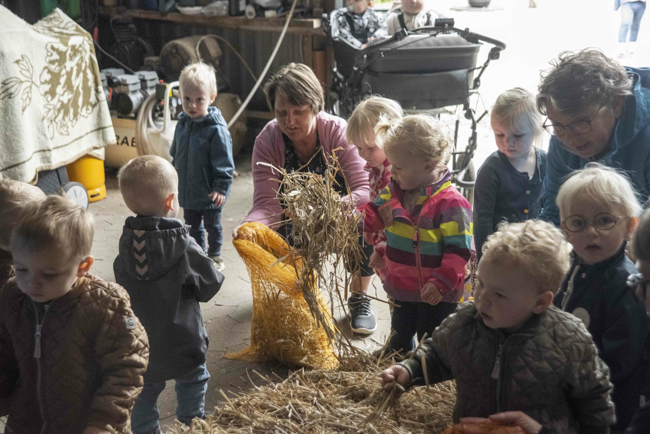 Selv om det småregnede, kunne de ca. 30 børn hygge sig i gården, før de sammen med de voksne skulle en tur i laden og fylde halm i sække, så de kunne kreere en flot heks. Der blev snakket lystigt og arbejdet. De yngste børn måtte se på fra barnevognene. I dagens anledning lavede vi et gruppebillede, så forældrene kan se en flok glade børn, der var samlet til hygge og arbejde hos Lone Mathiasen.