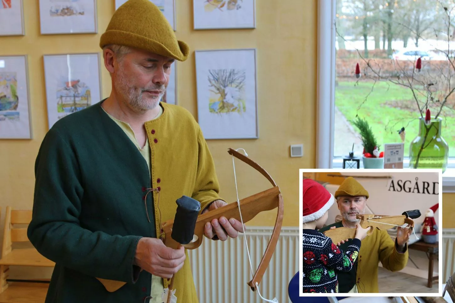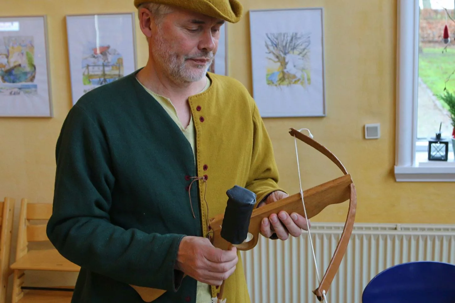 En af dagens børnegrupper kom fra Esbjerg Børnegård i Englandsgade. Børnene skulle alle prøve at skyde med en børnearmbrøst, som er indkøbt på et museum. Dan forklarer, at netop denne type armbrøst er lovlig, mens der er jo er forbud mod selv at lave netop dette våben. – Når børnene prøver at skyde med armbrøsten, så er jeg sikker på, at de får “noget” med hjem, som de kan huske længe efter.