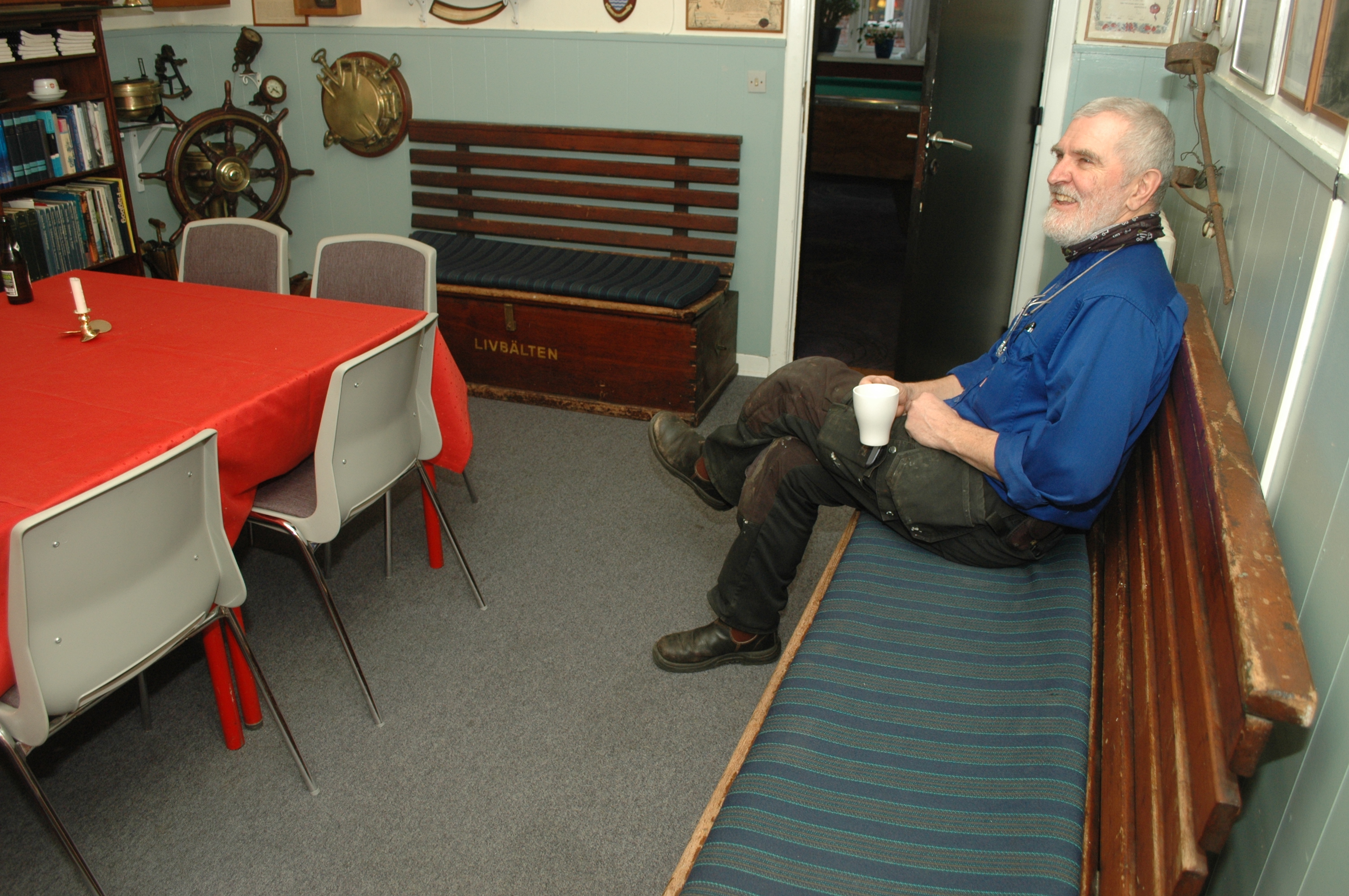 Heller ikke de to skibsbænke, der pryder lokalet, kender man historien på. Bænkene er på finsk og svensk påført ordet redningsbælter, så et godt gæt er, at det skib, bænkene har været på, har været finsk eller sejlet på Finland.