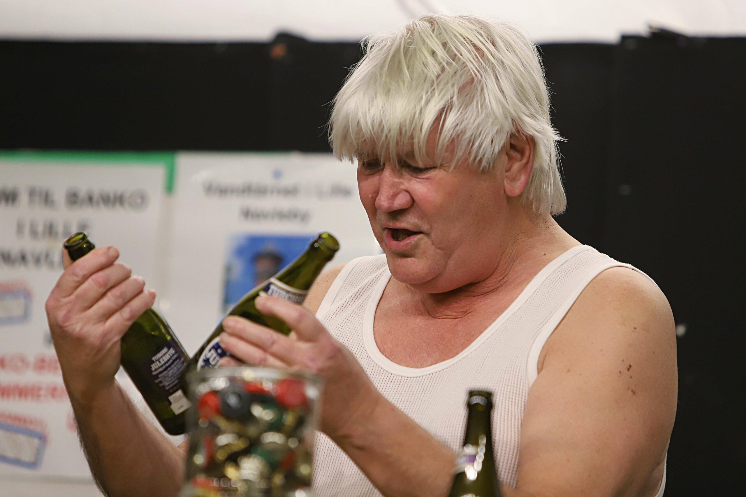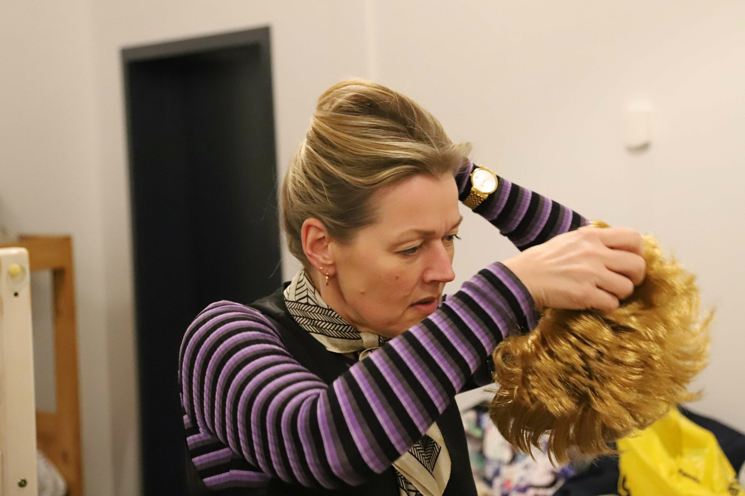 ”Banko Bent” – hovedrollen i “Kuk i Køje 3” – skal lige have lidt hårlak og et par spænder, så parykken kommer til at sidde perfekt. Det er de sidste små ting, der skal på plads i dilettanten, der har premiere på torsdag i Roager Medborgerhus og som gennemføres fredag og lørdag i henholdsvis Roager Medborgerhus som Spandet Forsamlingshus med spisning som mulighed.