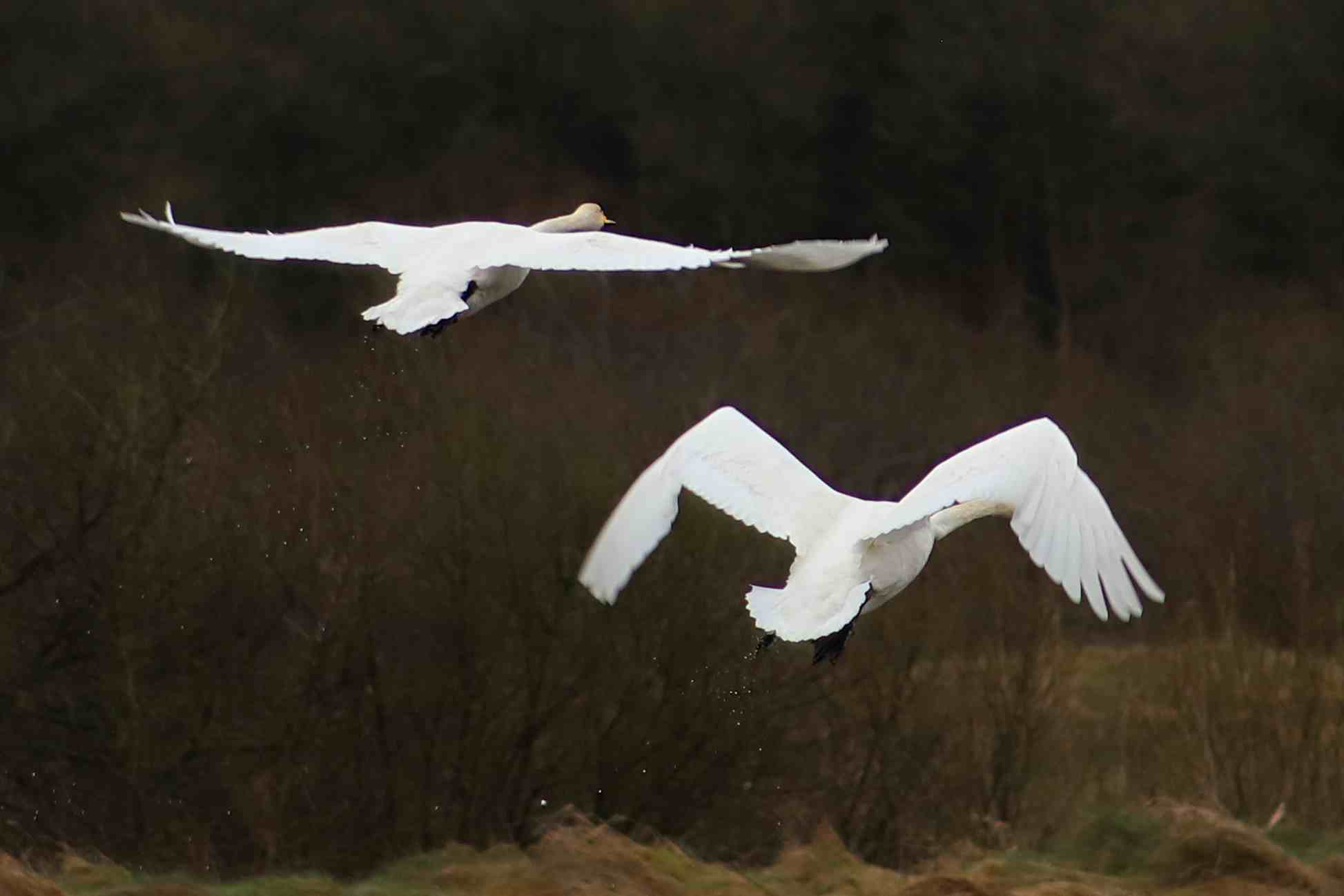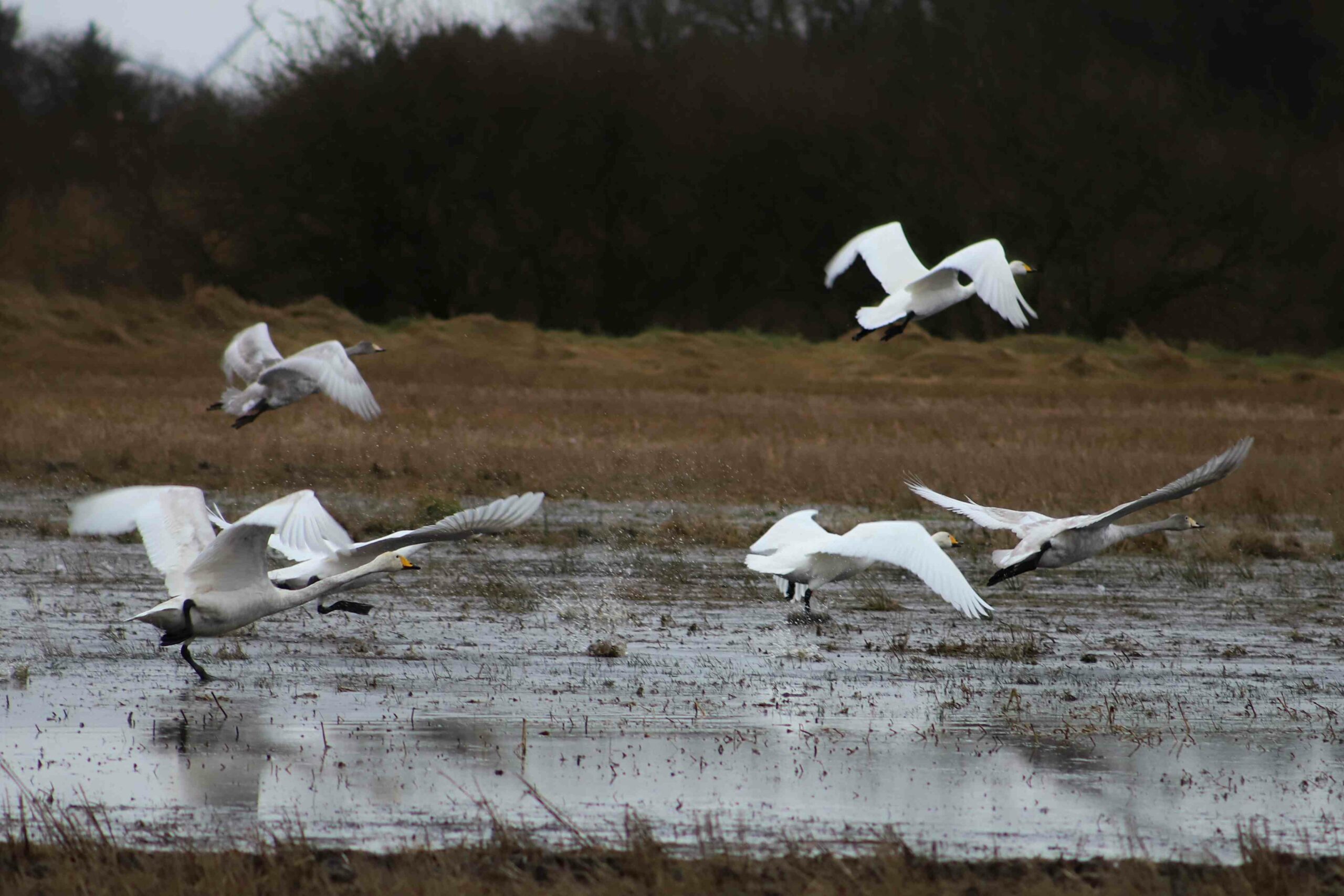 Sangsvanen er som tidligere beskrevet set syd for Hviding, men en lille flok har også slået sig ned ved mergelgravene syd for Tradsborg Plantage. RYK IND RIBE fik mulighed for at komme i nærheden af flokken ved Vesterlundvej. Længe reagerede flokken ikke på kameraet med teleobjektiv! Da en række svaner fløj hen over området, kom der pludselig gang i flokken – og med vingefang på 2-2,8 meter kom de voksne svaner i luften. Normalvægten svinger fra 9,8 kg til11 kilo – og med en længde på 1,4 m til 1,6 m.