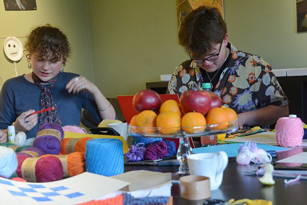På bordene er der masser af frugt samt en skål med slik. Desuden flyder bordene med garn i mange forskellige afskygninger, papir, lim, sakse og andet, der kan bruges til at udløse deltagernes kreativitet.