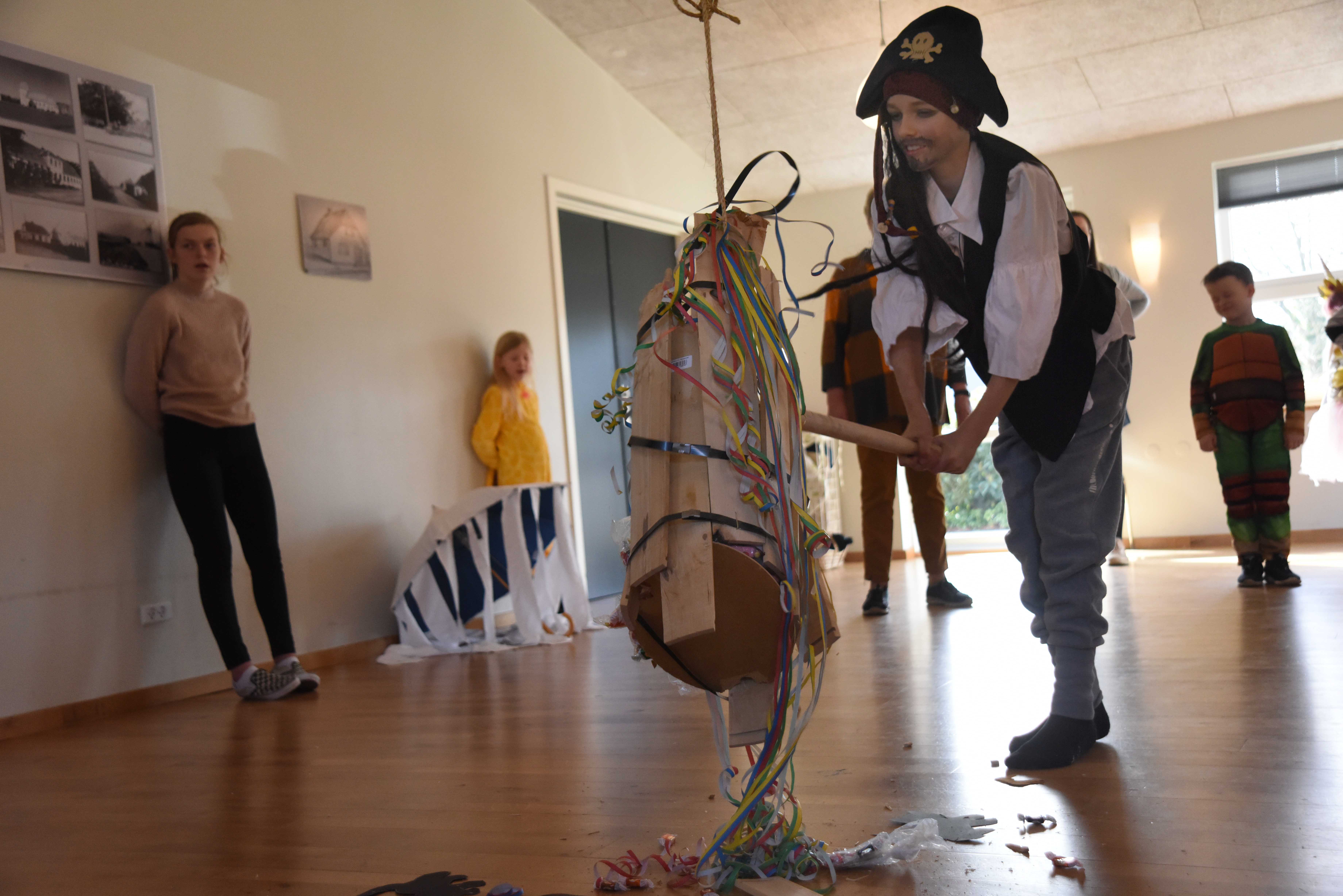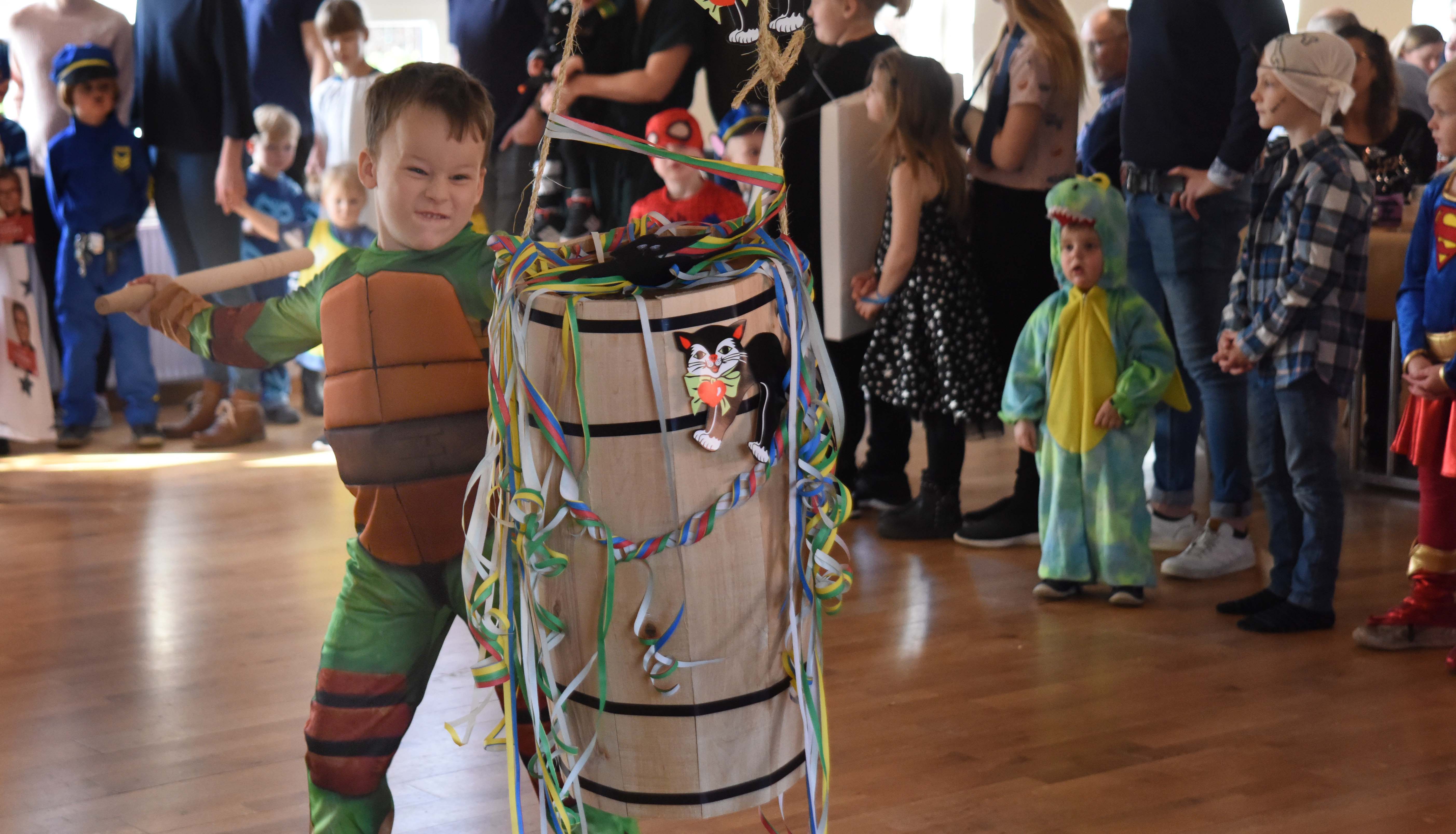 De udklædte børn tævede løs på tønden, en tønde der var udsmykket med fastelavnspynt som var fabrikeret til dagen hjemmefra.