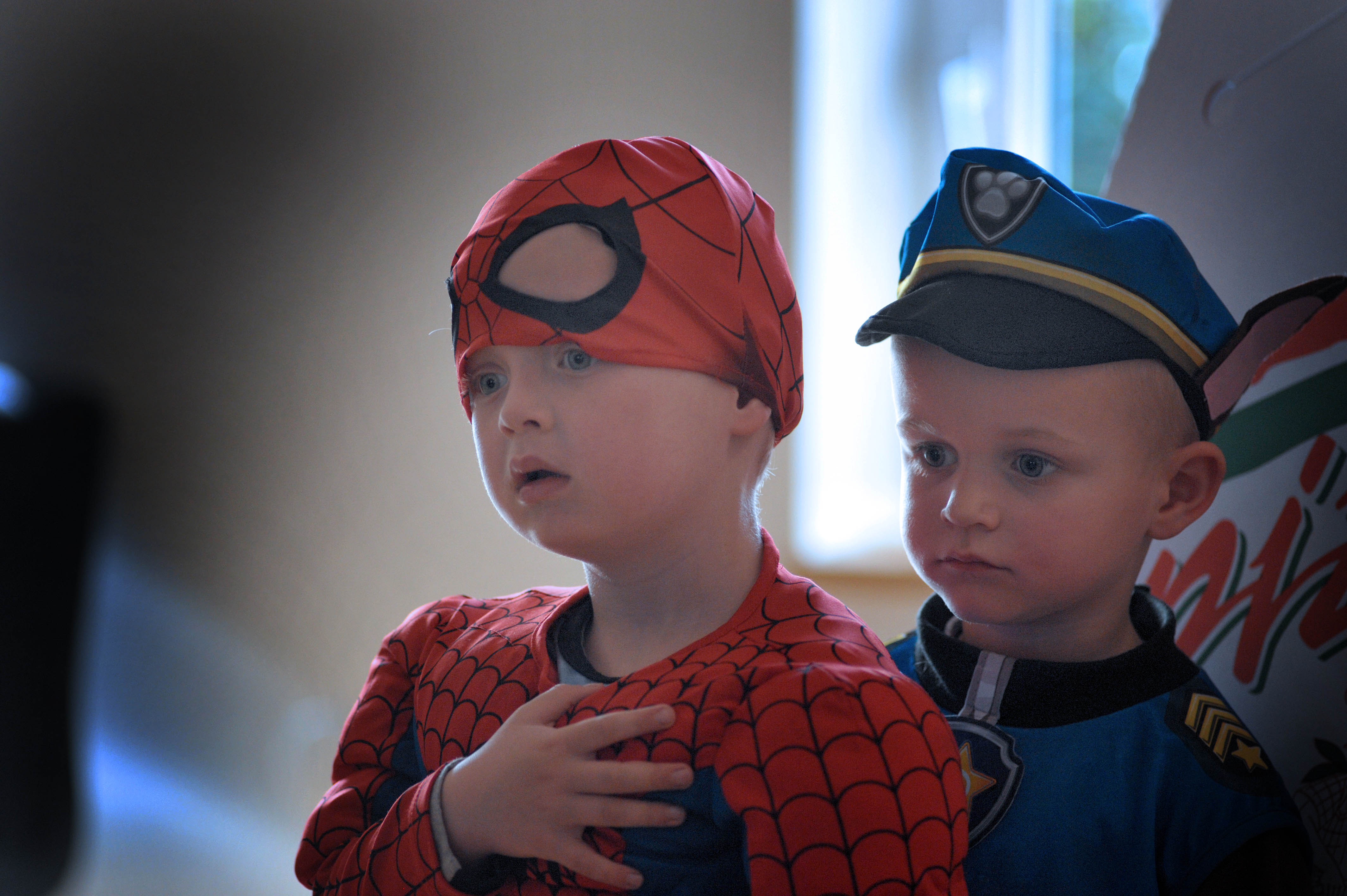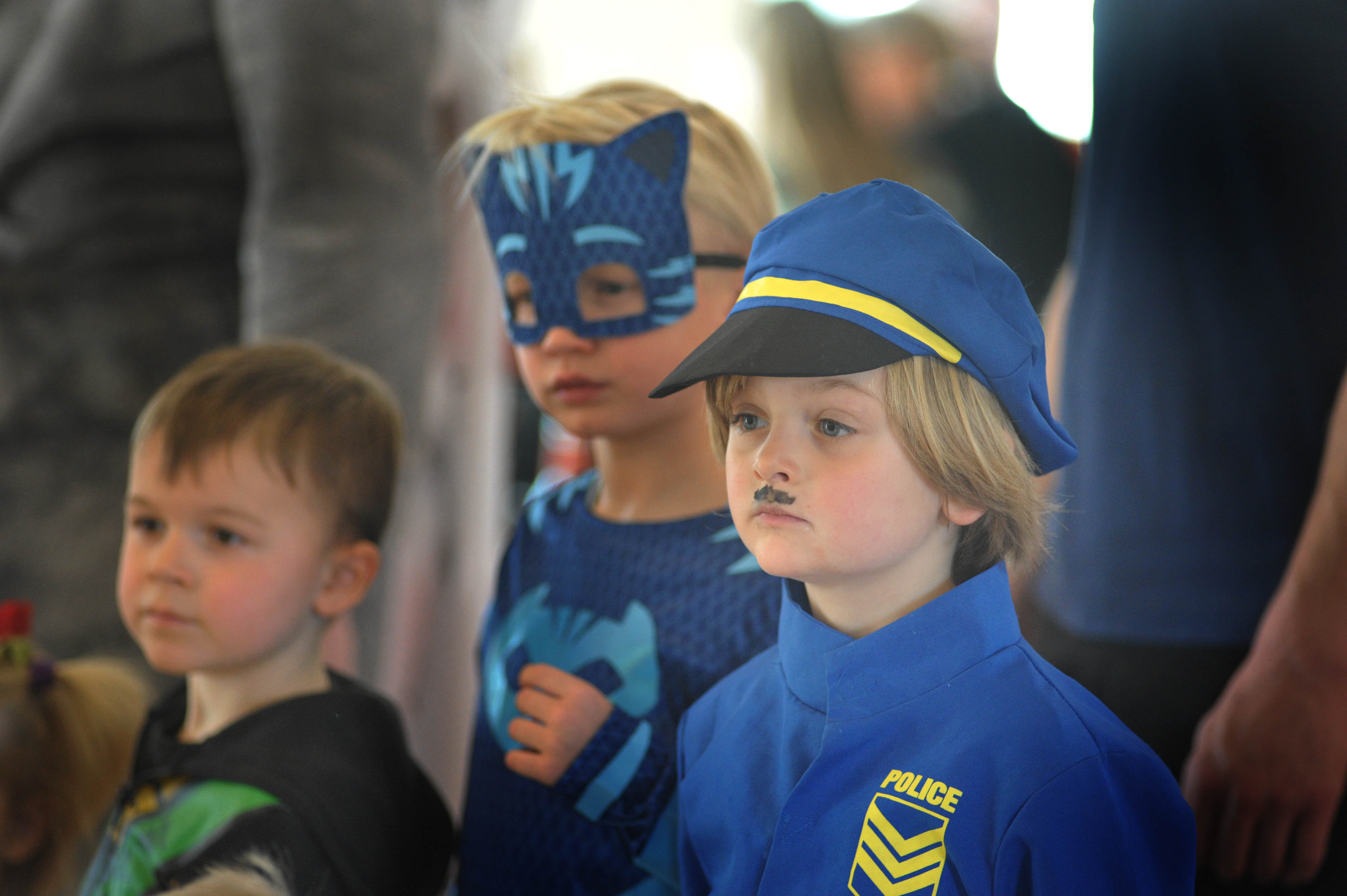 De mange børn var klædt festligt ud, der var en lille tiger, en turtle, Pippi langstrømpe og selvfølgelig prinsesserne i deres fine kjoler. Superpigen.Der var sørøveren, spiderman, soldaten, Starwarkrigeren, politibetjentene, ja sågar en pizza var med i tøndeslagningen.