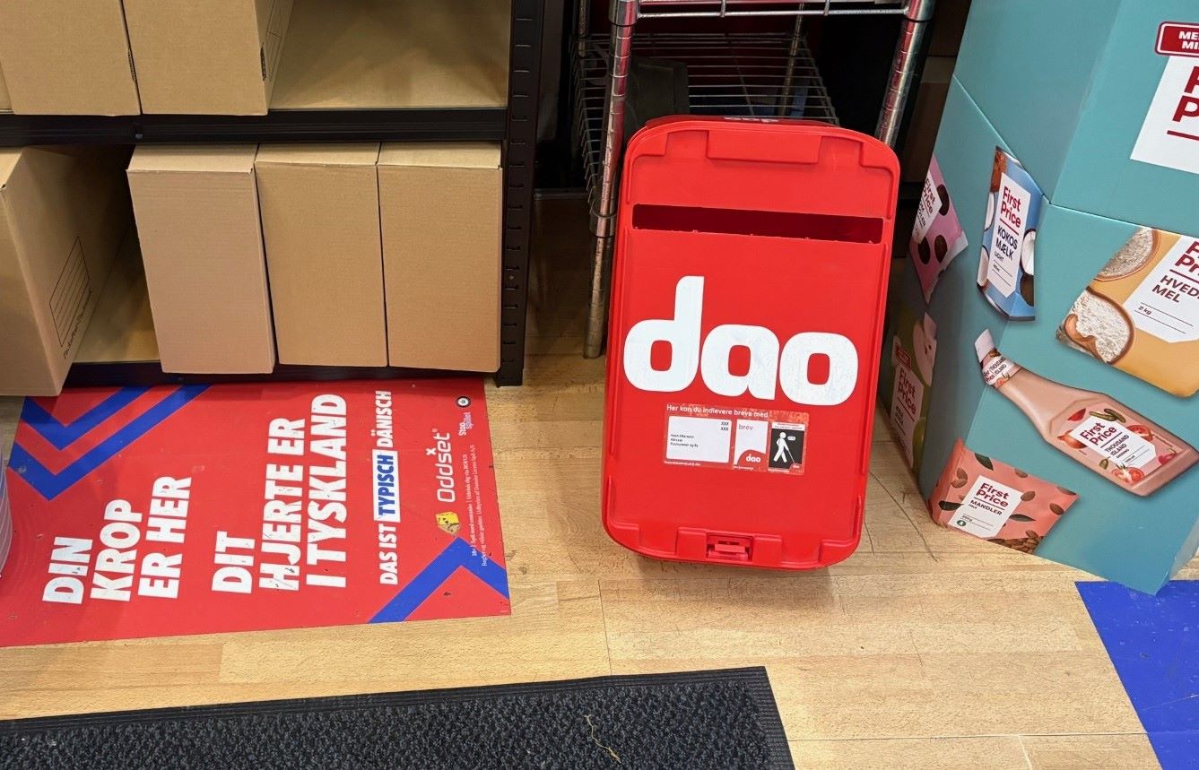 Ved indgangen til kiosken står der en ”rød postkasse” mærket med DAO. Her kan man aflevere fortrykte breve, og skal man sende et almindeligt brev, kan frimærkerne købes direkte i butikken.