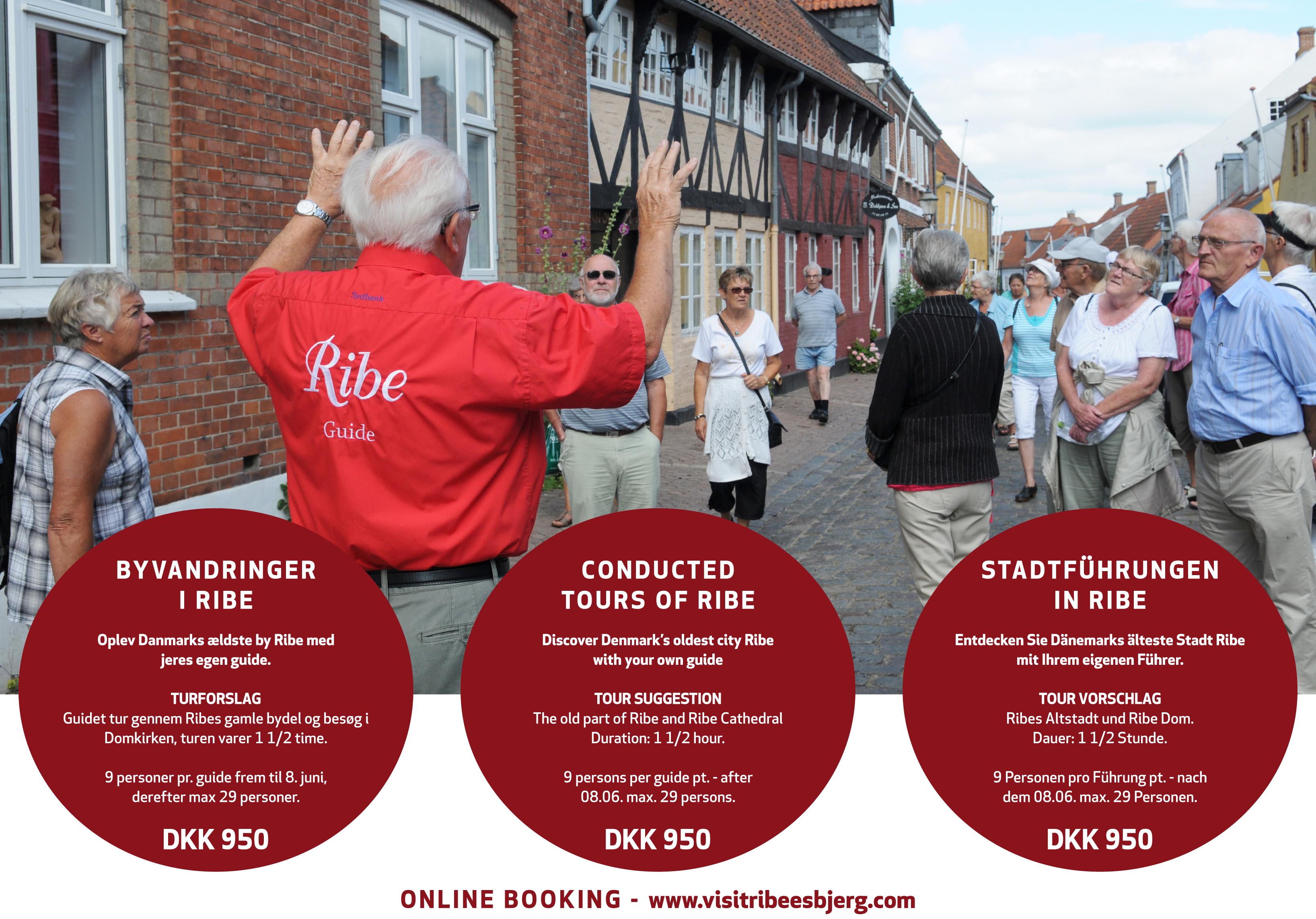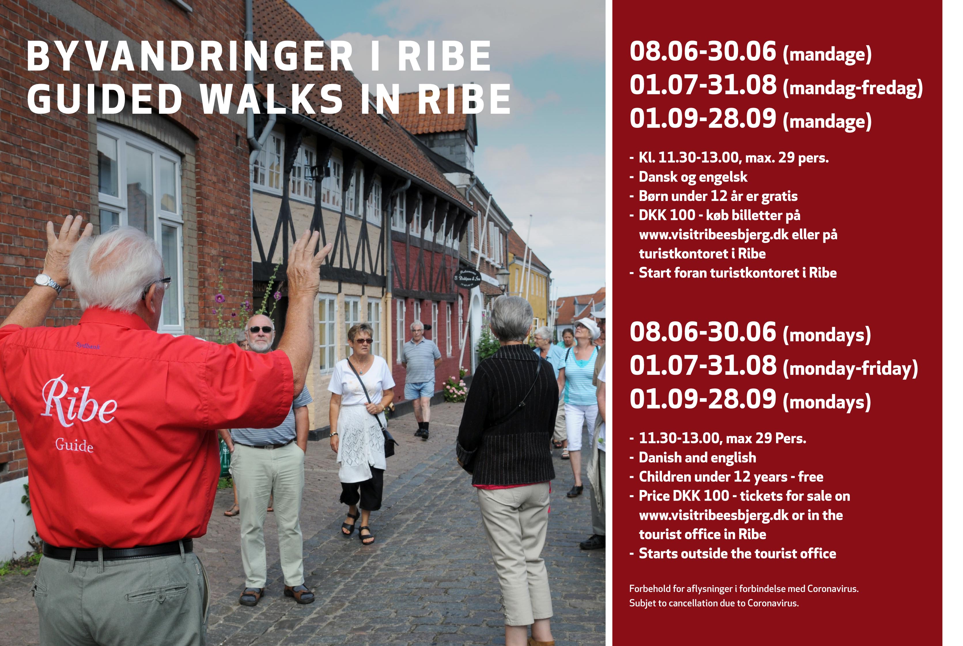 Ribes passionerede guider står parat til at tage byens gæster på spændende ture rundt i byen. Guiderne har tilrettelagt turene, så de overholder afstandskravene her under Coronakrisen. Man kan allerede nu bestille sin egen guide. Gruppen størrelse indtil 8.juni er max 9 personer. Efter denne dato håber man på at kunne udvide til 29 deltagere.
