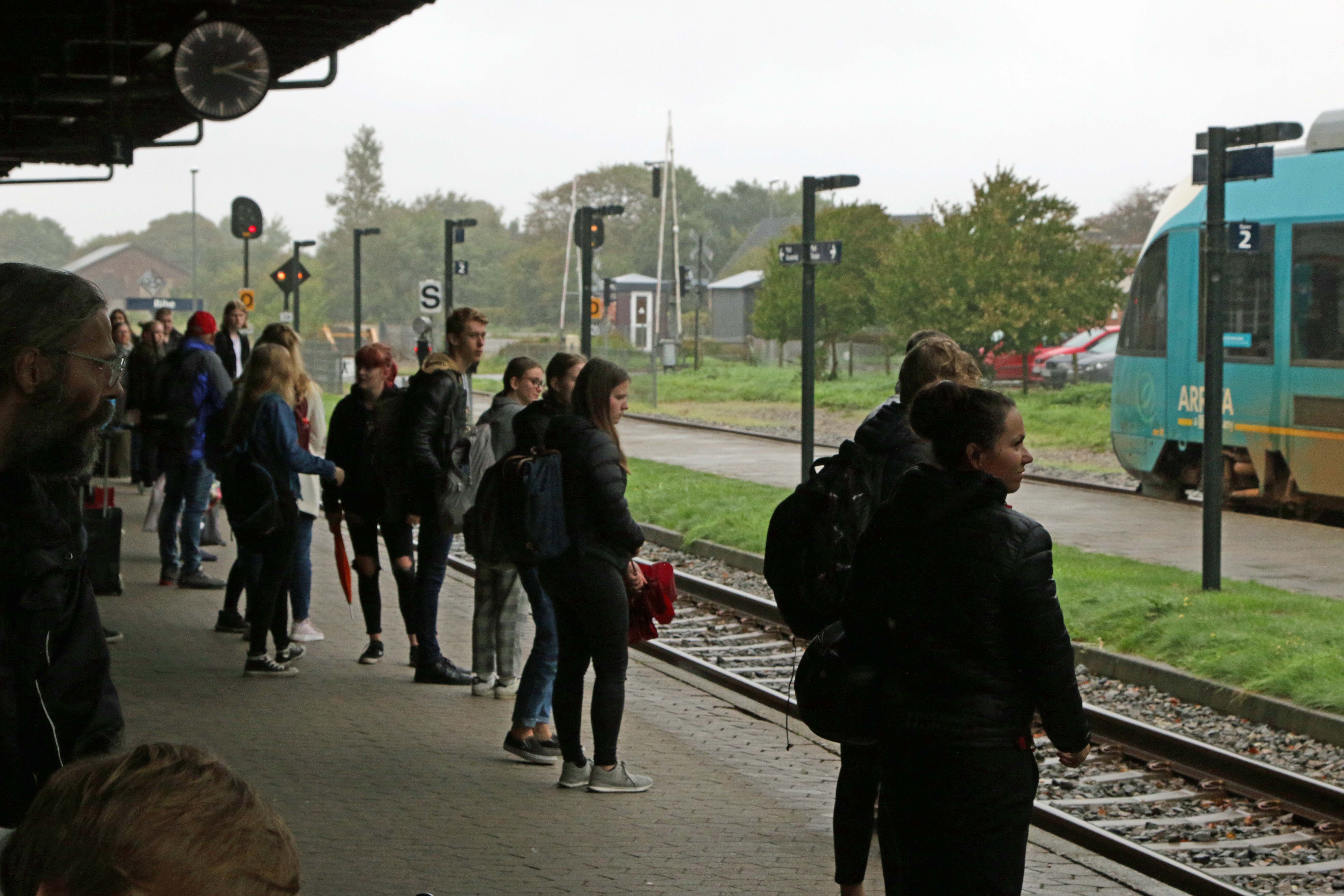 Ventetiden slås ihjel med at tjekke data på mobiltelefonerne – rigtig mange er i en anden verden, men vækkes så ved den advarende stemme: ”Gå ikke over sporet, der kommer tog.”