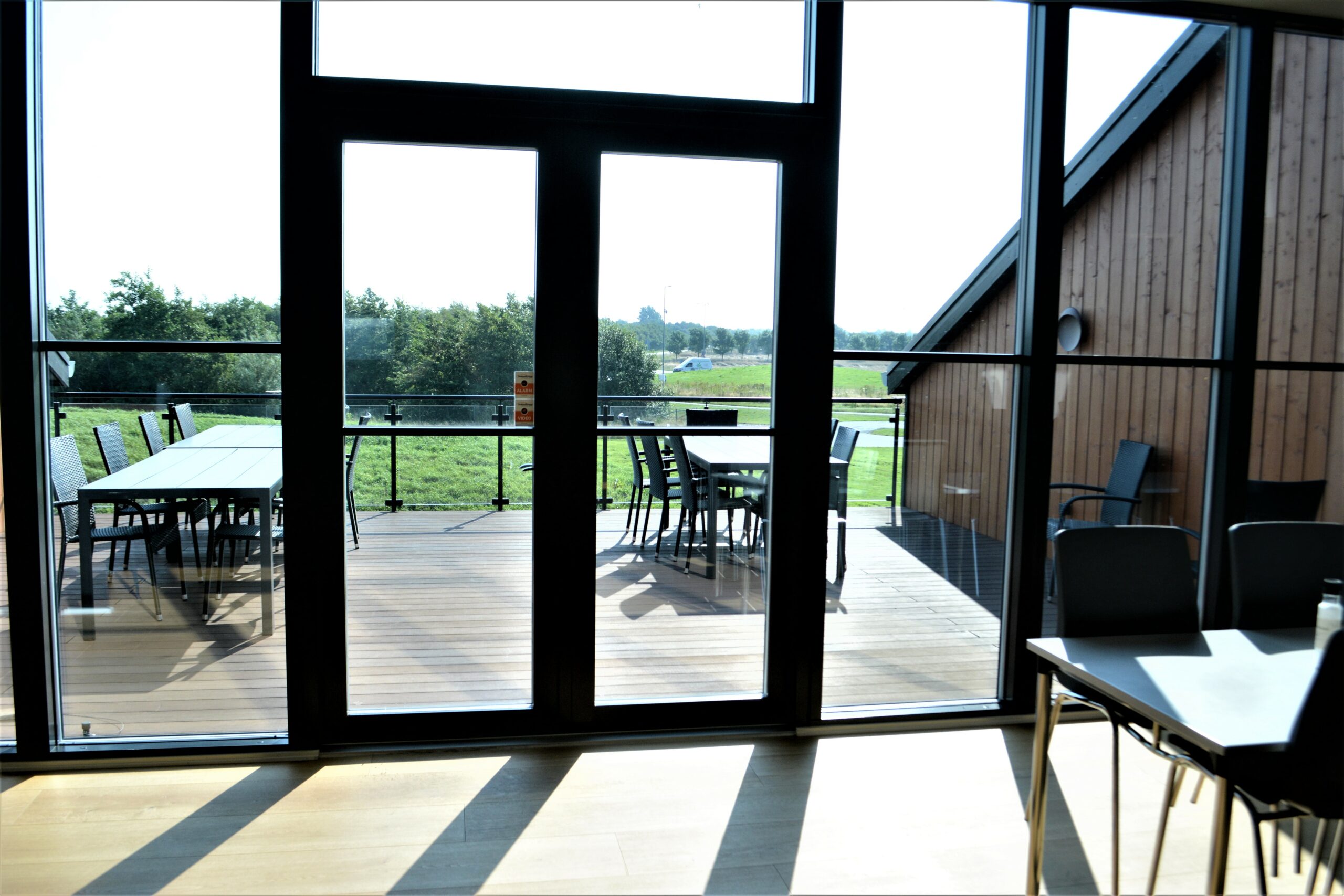 Tilbage til administrationsbygningen, hvor der er gjort meget ud af farve- og materialevalg netop for at det skal supplere firmaets vareudbud. Her har firmaets designere bl.a. været kraftigt inde over, og en af de ting, der falder i øjnene er de ”gammeldags” skydedøre i træ kørende på en skinne over døren. De er brugt som adskillelse ind til toiletafsnit, teknikerrum, depotrum og lignende.
