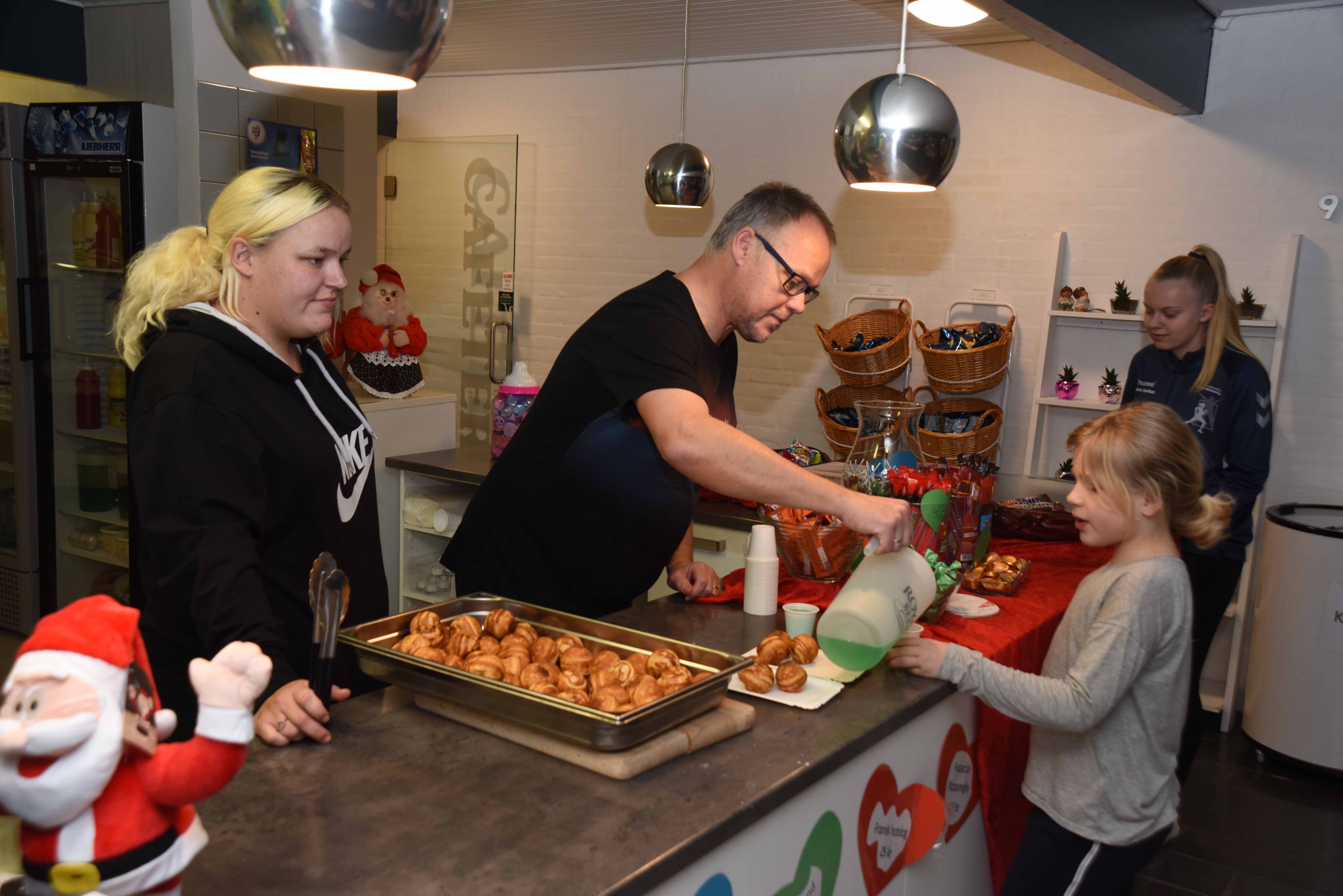 – Jeg har i dag fået hjælp af to af mine børn, Christiana og Johannes, og de var godt i gang med at gøre æbleskiver og saftevand klar i kantinen. Eftermiddagens menu til børnene er ud over æbleskiver og saftevand en minipizza og en kakaomælk inden de skal hjem. Hallen og cafeteriet var sponsorer for herligheder, som børnene nød med velbehag.