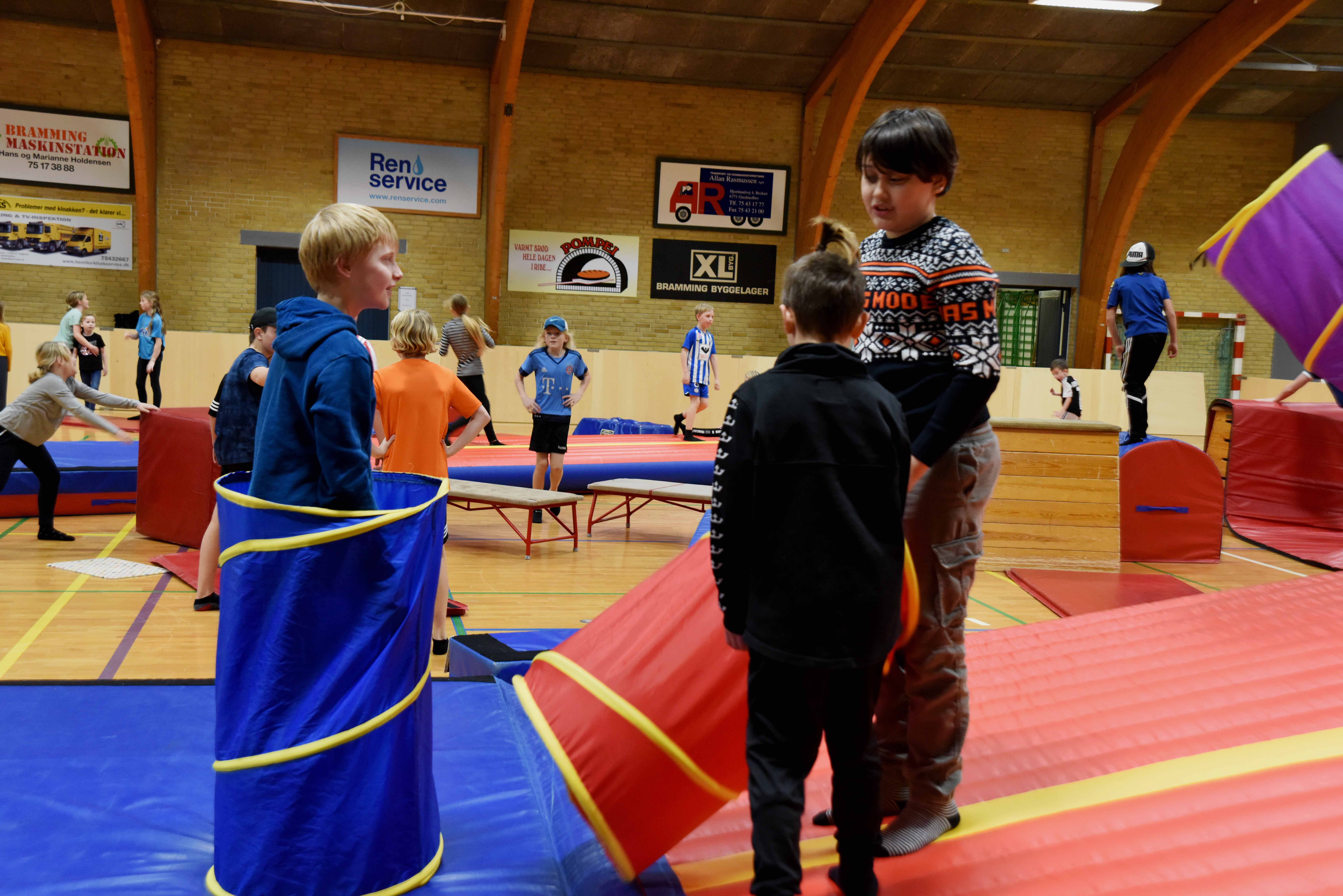 Stemningen var høj i hallen, hvor der kunne spilles fodbold og bruges lidt ”krudt” på den indrettede Tarzanbane. Christian Hulgaard var der med sine tre børn, fortalte det var første gang de var med til arrangementet. Når man nu er her, kan man lige så godt give en hånd med, mente Christian Hulgaard, der kun havde ros tilovers for den flittige halbestyrer.