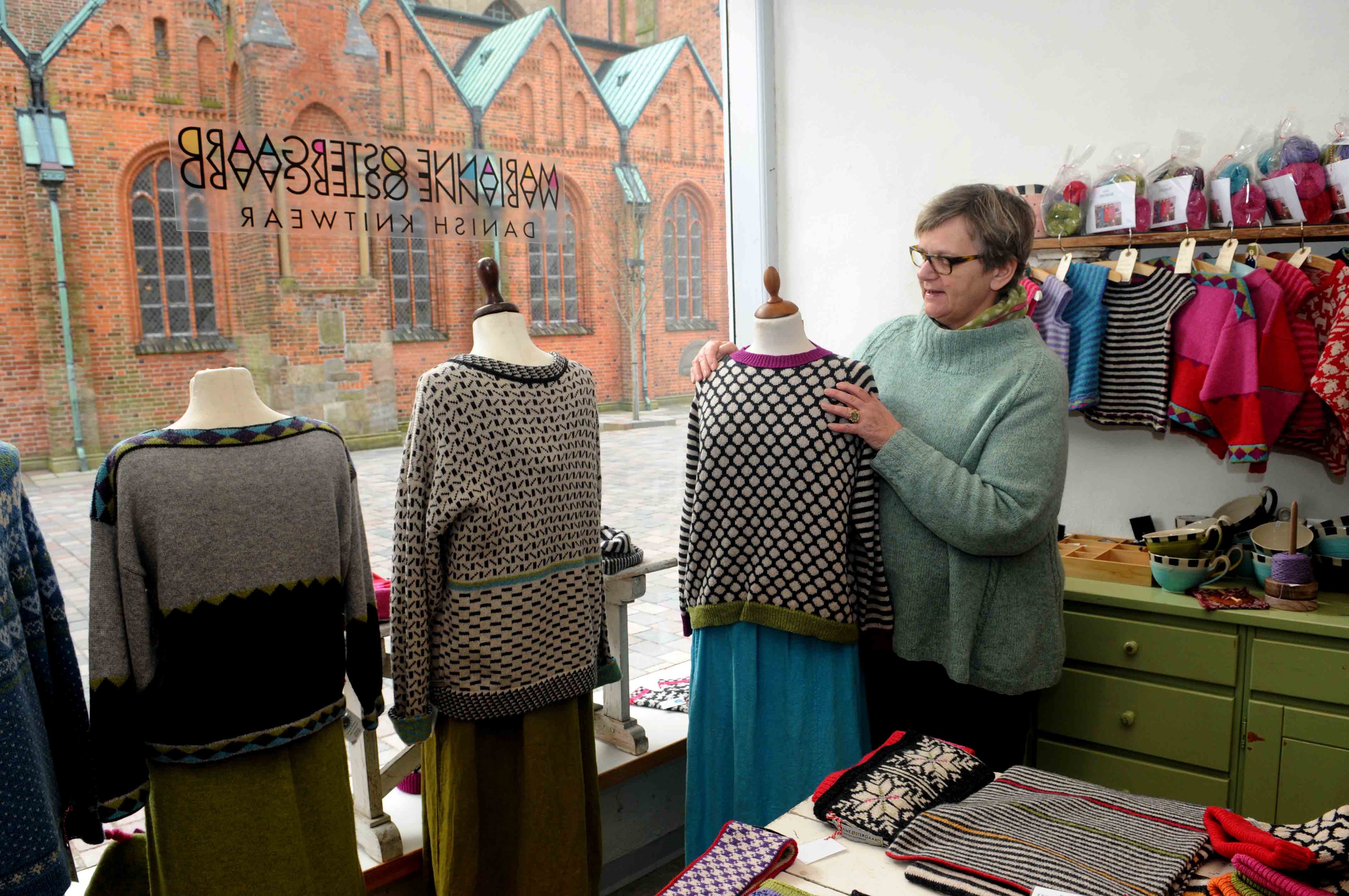 – Vi har et stort udvalg af de modeller jeg gennem næsten 35 år har designet. Der er Børne, dame og herremodeller. Og en masse tilbehørsmodeller. Der er de klassiske modeller jeg designede i 80’erne og 90’erne og de aller nyeste modeller. Hvis man ønsker andre farver, end dem jeg har valgt, er man meget velkommen til at kontakte mig og så kan vi sammen finde frem til de ønskede farver. Og man er altid hjertelig velkommen i vores fysiske butik på Domkirkepladsen i Ribe, hvor der er et stort udvalg af modeller og nu også, som noget nyt, garn i løs vægt, slutter Marianne Østergaard af, inden de næste kunder skal betjenes.