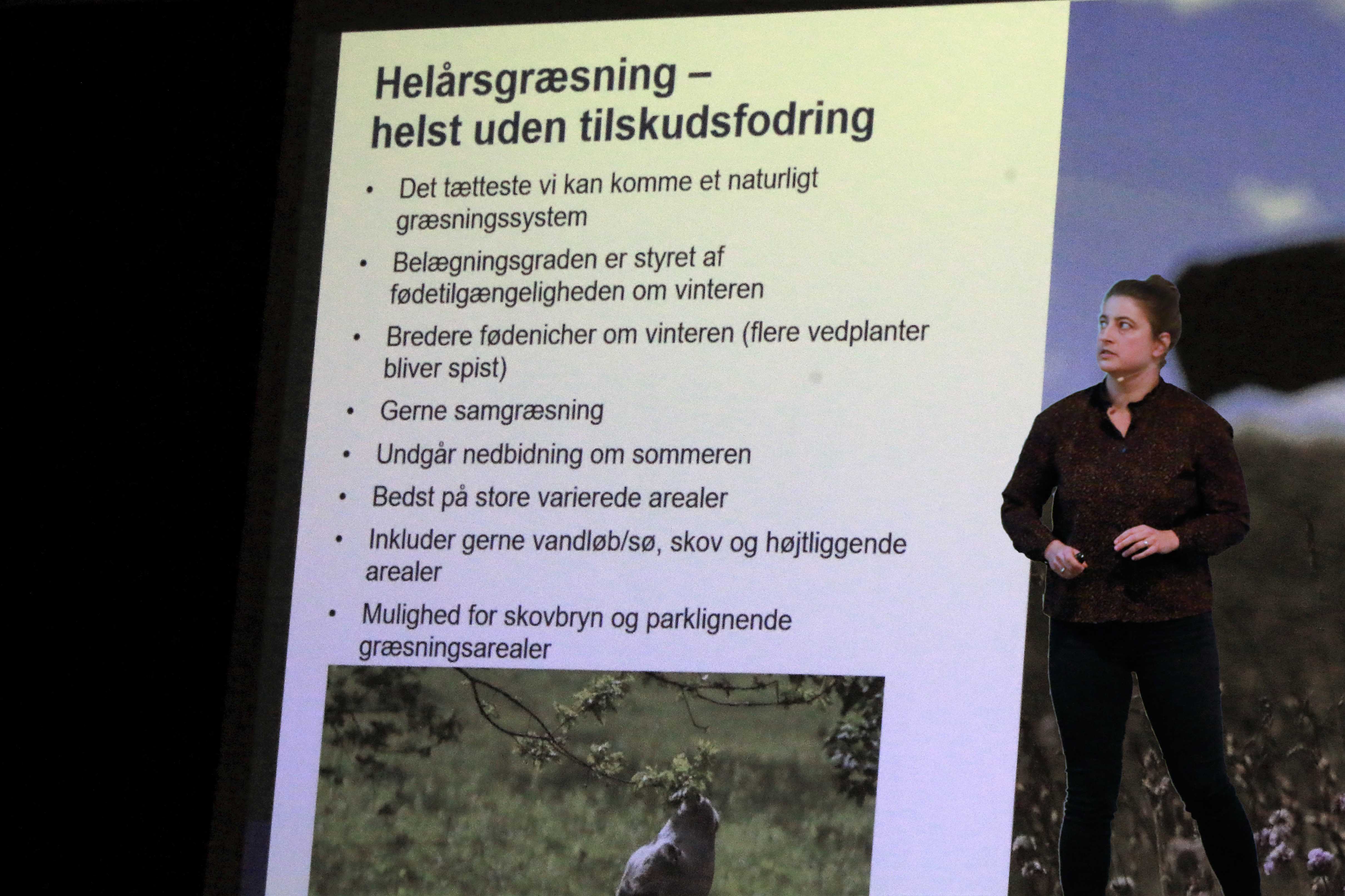 Konsulent Andrea Oddershede gav et levende oplæg med titlen: ”Mod en rig og vild natur – græssende dyr som værktøj.” Og der blev ikke sparet på billedsproget, da hun havde været inden på det naturlige dyretryk, som skal justeres efter arealets vinterbæreevne samt helårsgræsning.