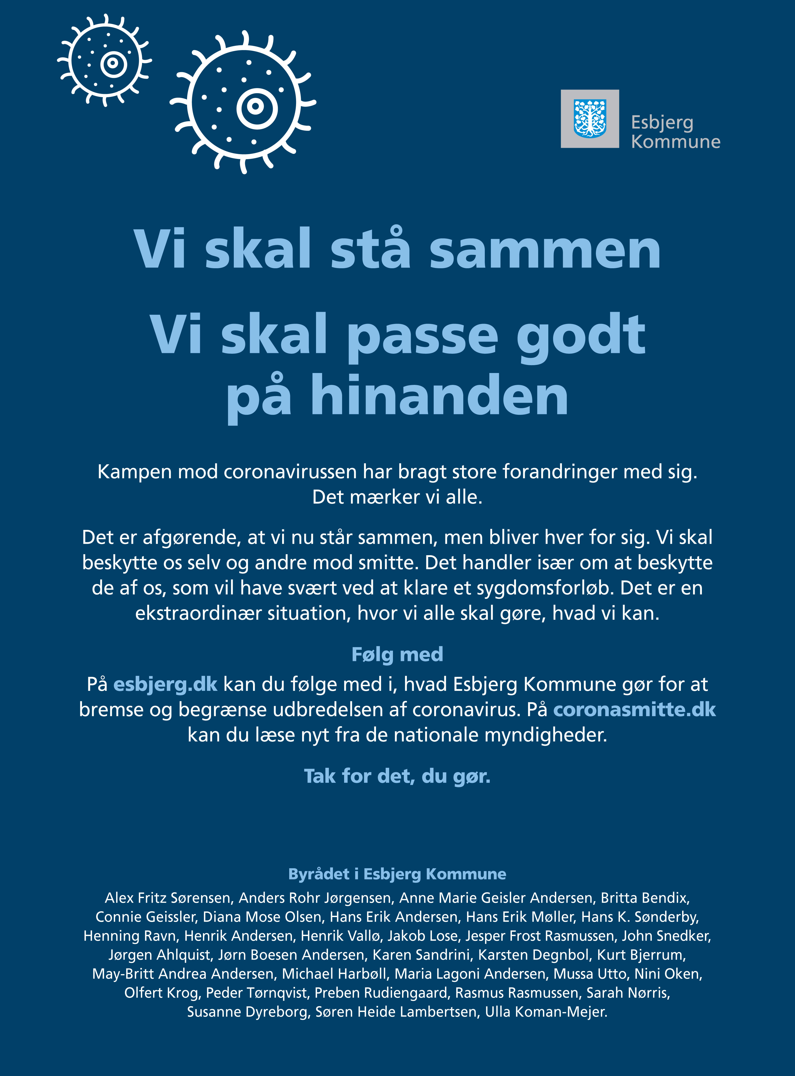 – Det er afgørende, at vi nu står sammen, men bliver hver for sig. Vi skal beskytte os selv og andre mod smitten. Det handler især om at beskytte de af os, som vil have svært ved at klare et sygdomsforløb. Det er en ekstraordinær situation, hvor vi alle skal gøre hvad vi kan, slutter Esbjerg byråd i en annonce, og samtidig sender de tak til den enkelte borgere for det de gør.